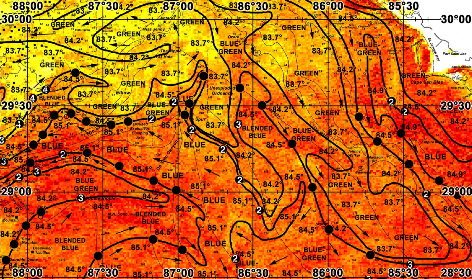 Eastward on your way west/southwestward from the Cape San Blas area, towards the Squiggles area and offshore towards the Pensacola South NOAA buoy, increased chances for fishing action occur where we observed the eastern edge of the relatively warmer and cleaner (84.5°F) blended blue/blue-green water over the 100-150 fathom depths from 86°26’W & 29°30’N to 86°14’W & 29°17’N to 86°06’W & 29°01’N to 86°00’W & 28°47’N. South of the Pensacola South NOAA buoy, good chances for offshore action with tuna, wahoo, dolphin and billfish action occur where we observed the inshore northern edge of the blue (84.8°F) water for two and three days now over the 150-200 fathom depths from 85°44’W & 28°29’N to 86°04’W & 28°29-30’N with similar chances for action occurring offshore over the 300-500 fathom ledges southwestward where we observed the western edge of the same blue water for two days from 86°24-25’W & 28°27’N to 86°28’W & 28°08-09’N. Continuing westward over the 300-400-500 fathom ledges, good action is also likely to happen where we observed the eastern edge of the relatively warmer cleaner blue water and favorable ocean conditions for two days now as well from 86°36’W & 28°36-37’N to 86°35’W & 28°22’N to 86°37’W & 28°13’N. Northeast of the Lloyd Ridge area, good chances for action occur where we observed the western edge of the blue (85.1°F) water moving in a favorable inshore direction over the 1000-1500 fathom ledge and towards the 400-500 fathom ledges particularly where the ocean conditions have remained favorable for three days from 85°55’W & 27°48-49’N to 85°55’W & 27°58’N to 85°50’W & 28°04’N. If fishing action is not satisfactory in these areas, good action is also likely to happen southeastward where we observed the northwestern edge of the cooler (83.9°F) blue water and favorable ocean conditions for two days now from 85°39’W & 27°40’N to 85°33’W & 27°54’N.