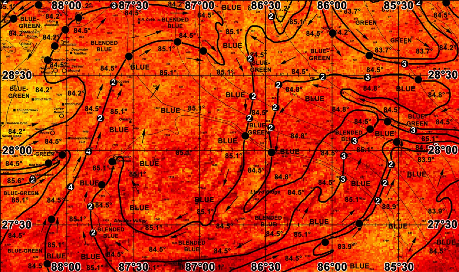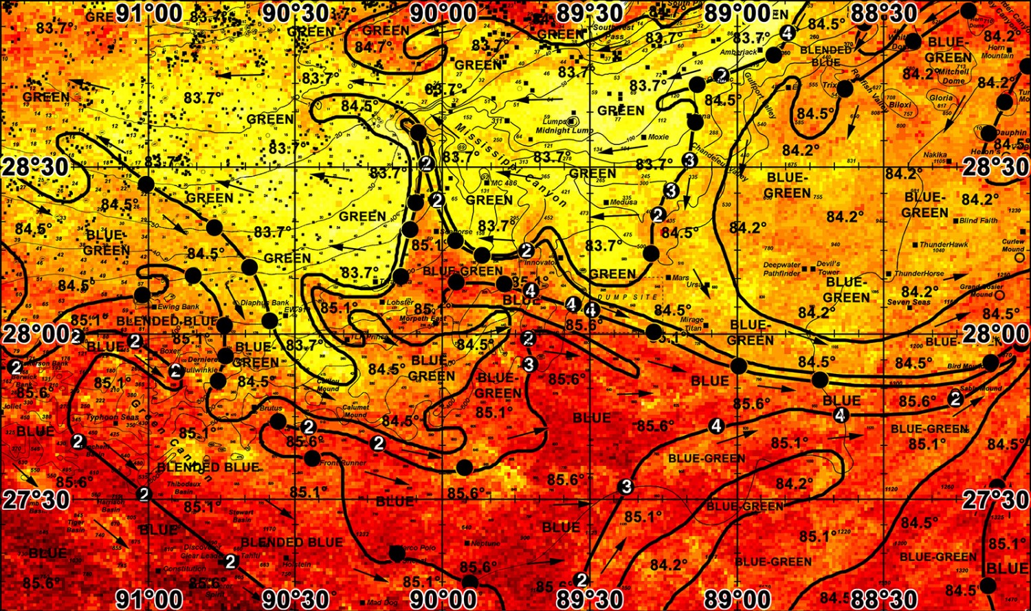 East of the Green Canyon area, good chances for fishing action occur where we observed the northern edge of the offshore dark blue (85.6°F) water particularly where the ocean conditions have remained favorable for two days now just offshore of the 500 fathom ledge between the Calumet Mound and the Front Runner Rig from 90°27’W & 27°43’N to 90°13’W & 27°41’N with increased chances for action occurring southward towards the Front Runner Rig (90°24’W & 27°37’N) and the Marco Polo Rig (90°10’W & 27°20’N) where we observed favorable conditions for the first time today. Inshore of the Green Canyon from the Bullwinke area and northwestward southwest of the Ewing Bank and towards the Patterson Bank, good action is also likely to occur where we observed the northern edge of the blue (85.6°F) water and favorable conditions for two days now from 90°54’W & 27°53’N to 91°02-03’W & 27°58-59’N to 91°13-14’W & 28°00’N to 91°27-28’W & 27°54’N. Offshore southward, good chances for action occur where we observed the northeastern edge of the same dark blue (85.6°F) water and favorable conditions for two days now from the Penchant Basin, over the area between the Harrison Basin and the Thibodeaux Basin and offshore towards the Discoverer Clear Leader Rig from 91°13-14’W & 27°40’N to 91°01’W & 27°30’N to 90°43-44’W & 27°19’N.