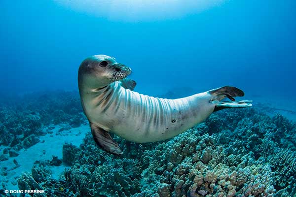 Above: This young female monk seal became a public safety hazard and had to be removed from the MHI population after being illegally fed by humans. Photo Credit – Doug Perrine.