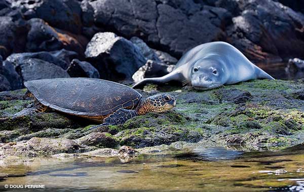 Above: A young male shares a resting spot with a green sea turtle. Photo credit: Doug Perrine.