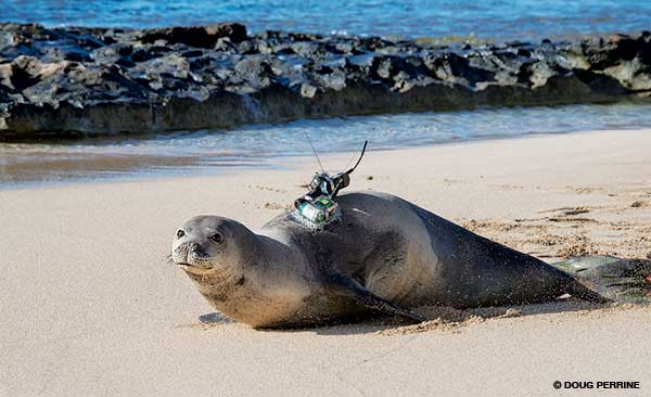 Above: After its release by NOAA scientists, a seal heads back toward the water loaded with a National Geographic crittercam. Photo credit: Doug Perrine.