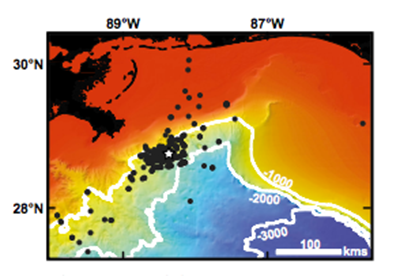 Above: Map of the northern Gulf of Mexico showing the sampling locations (black dots) and the Macondo Well (white star) overlaid on the National Geophysical Data Center Coastal Relief Model bathymetry.