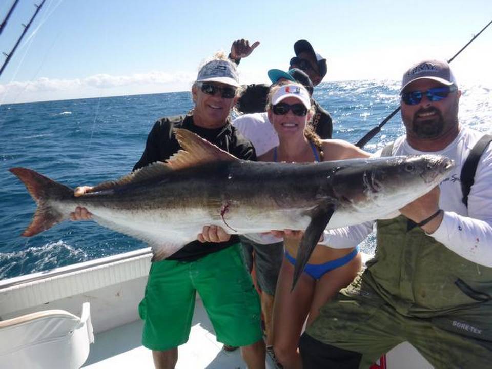 Above: Winning crew – The crew of “Free Spool” celebrates Mindy Marks’ 54-pound cobia, caught on the way to winning the Dust ‘Em Off Sailfish Warm-Up. Photo Credit: Sue Cocking. Miami Herald Staff.