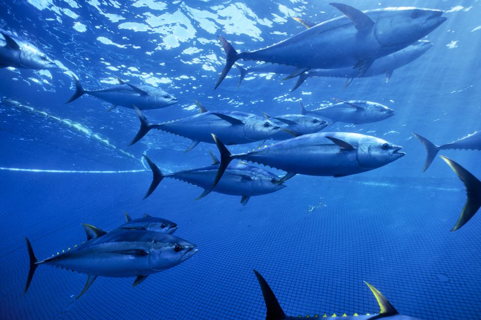 Above:  A school of Pacific yellowfin tuna is caught in a purse seine, a common type of fishing net for capturing fish that aggregate near the surface of the water. PHOTOGRAPH BY DOC WHITE, NATURE PICTURE LIBRARY/CORBIS