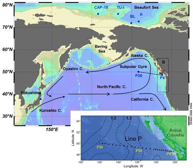 Above: Figure 1. Map showing the location of the site of the Fukushima Dai-ichi Nuclear Power Plant accident in Japan. Stations are indicated at which seawater samples were collected in 2011-2014 on Line P and in 2012 in the Beaufort Sea. Box B represents the model domain for which Fukushima-derived Cs-137 time-series concentrations were estimated by Behrens et al. (6). Station R is the cross shelf regime for which the Rossi et al. (7,8) model results apply. Inset shows sampling station locations along Line P. Dashed curves are time-averaged streamlines representing the mean dynamic height field for 2002-2012 indicating the northward geostrophic transport of the Alaska Current across Line P.