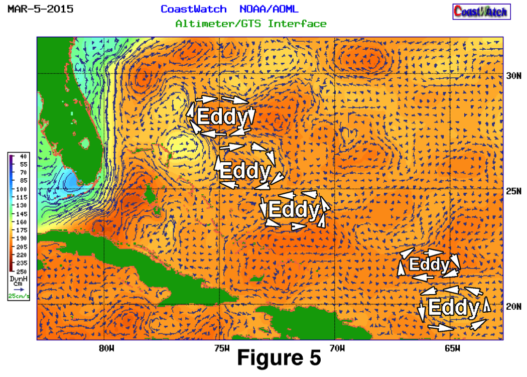 Figure 5 (below) is an enhancement of the visualization of the currents derived from satellite altimeters by NOAA AOML’s CoastWatch program. The two major eddy features that are effecting the currents now and three additional ones are shown. The key to getting the most blue marlin water and fish to Eleuthera and Abaco is by having the center of circulation of a clockwise rotating eddy come within 30 miles of the land. This will result in a strong eddy current pulling the water over the favorable subsurface ledges and sea mounts.