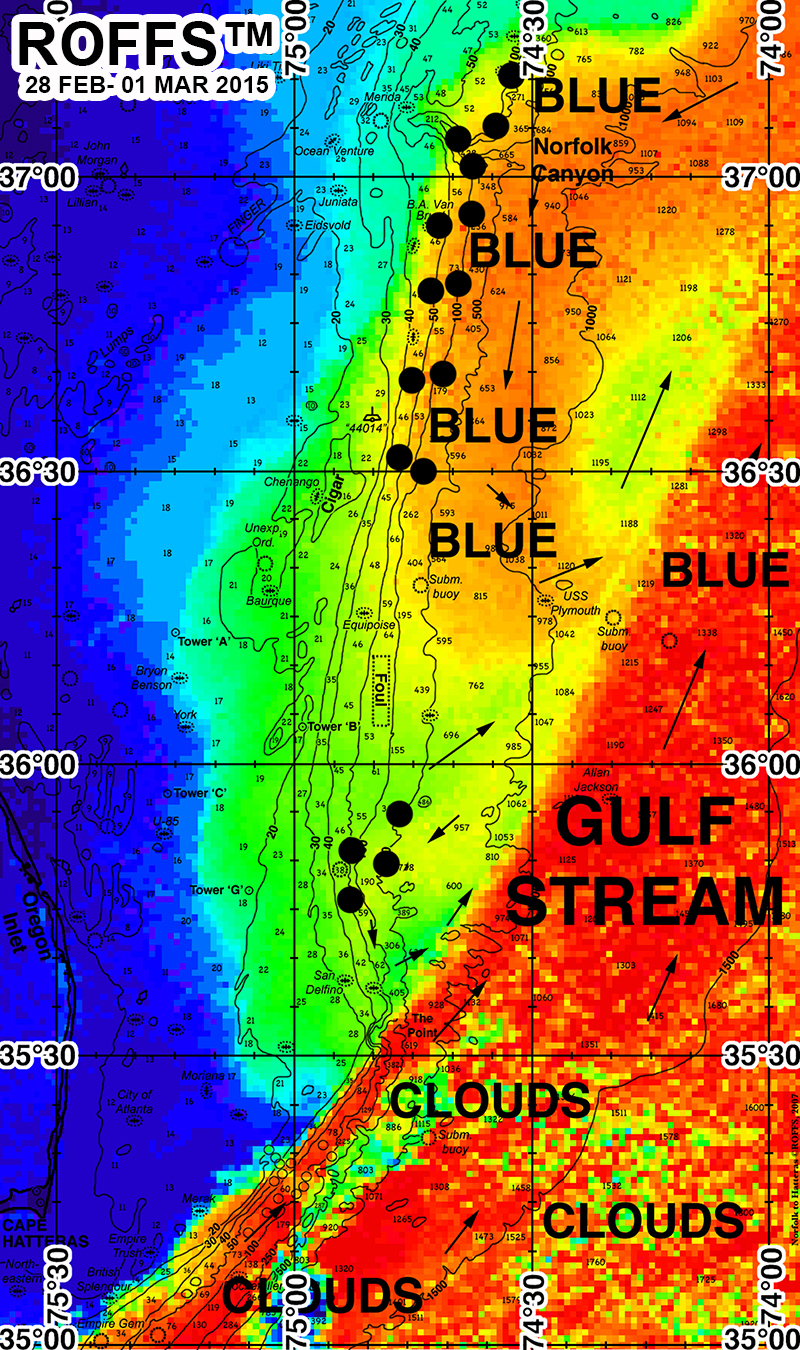 Good chances for tuna, swordfish, mako sharks and wahoo action in the blue Gulf Stream (65°F-67°F) water that extends over the 100 fathom curve from Norfolk Canyon southward over “Foul Bottom area and further southward towards Oregon Inlet, as seen in this 24 hour composite of high resolution infrared SST satellite images from this past weekend (Saturday AM through Sunday AM).