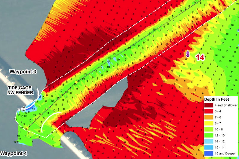 U.S. Army Corps of Engineers dredges have been working to open an unmarked channel through the shoaled area that will allow use of the bridge’s navigation span, where wooden fenders protect pilings.