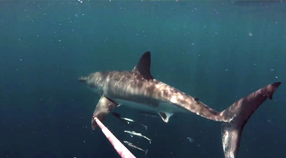 Joe tossed me the GoPro, and as I proceeded to make my way back to the jug and decend, the shark made a surprise appearance behind me on the surface.
