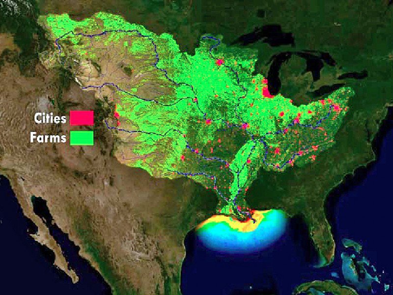 Above: A visualization of how nutrient runoff from farms (green) and cities (red) in the Mississippi River Basin influences algal blooms in the Gulf of Mexico. The warmer colors represent a higher concentration of algae. NOAA scientists predict that the size of the 2015 Gulf of Mexico dead zone, which is caused by the decomposition of these blooms, will be about the size of Connecticut. Credit: NOAA