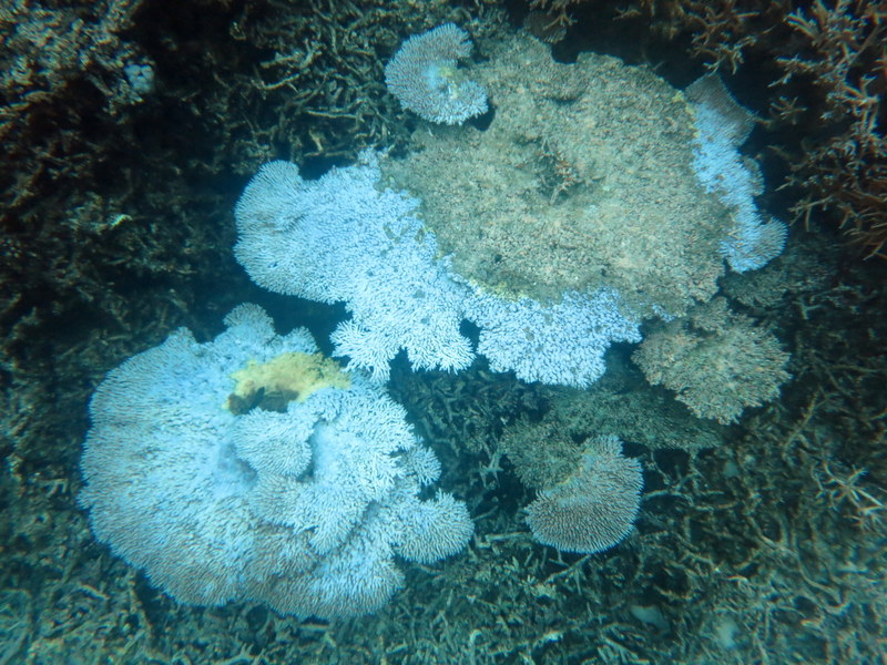 Above: Bleached and dead Acorpora coral in the National Marine Sanctuary of American Samoa. Warm Pacific ocean temperatures may lead to an increase in coral bleaching, NOAA scientists said. (Credit: NOAA)