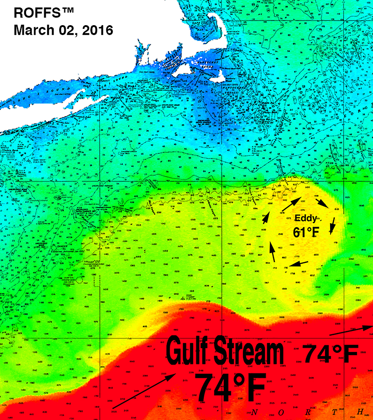 Early tuna, mahi and wahoo and swordfish are expected in the canyon areas south of New York, Connecticut, and Massachusetts as a Gulf Stream eddy is now over the Hydrographer Canyon as observed in last week’s satellite imagery. Surface water temperatures are already 61°F in this eddy and new Gulf Stream water this week is expected to bring warmer water and new fish to this eddy. We anticipate that this eddy will drift westward over the next several weeks and continue to warm and gain fish with each Gulf Stream interaction. Stay tuned to ROFFS™ for your latest information. Bahamas seasonal forecast coming soon and then the northeast canyon seasonal forecast shortly after as time provides. We are already very busy providing daily, high resolution, comprehensive fishing forecasting analyses for clients who are fishing south of Virginia. Note the much larger eddy off Georges Bank at the top right hand corner of the image. Word to the wise, get your boats ready now!