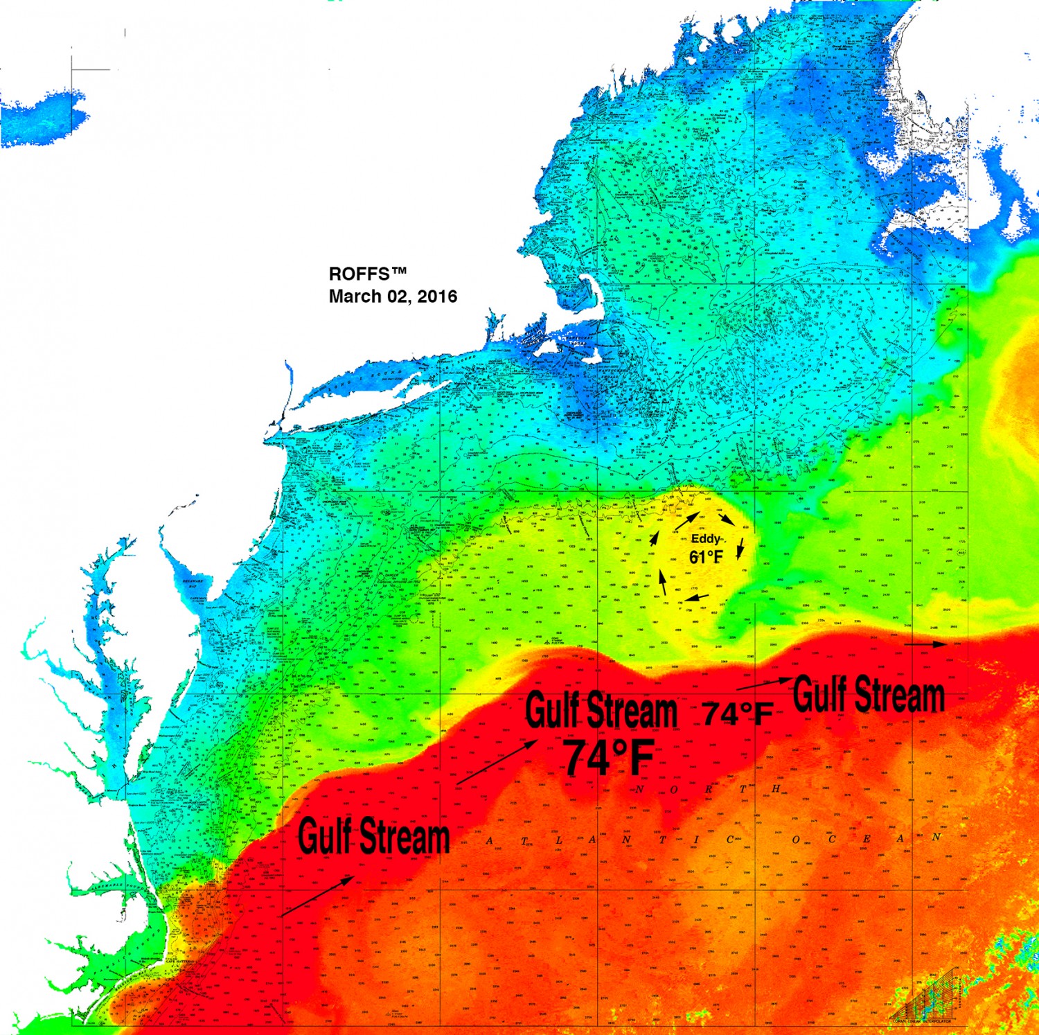 Early tuna, mahi and wahoo and swordfish are expected in the canyon areas south of New York, Connecticut, and Massachusetts as a Gulf Stream eddy is now over the Hydrographer Canyon as observed in last week’s satellite imagery. Surface water temperatures are already 61°F in this eddy and new Gulf Stream water this week is expected to bring warmer water and new fish to this eddy. We anticipate that this eddy will drift westward over the next several weeks and continue to warm and gain fish with each Gulf Stream interaction. Stay tuned to ROFFS™ for your latest information. Bahamas seasonal forecast coming soon and then the northeast canyon seasonal forecast shortly after as time provides. We are already very busy providing daily, high resolution, comprehensive fishing forecasting analyses for clients who are fishing south of Virginia. Note the much larger eddy off Georges Bank at the top right hand corner of the image. Word to the wise, get your boats ready now!