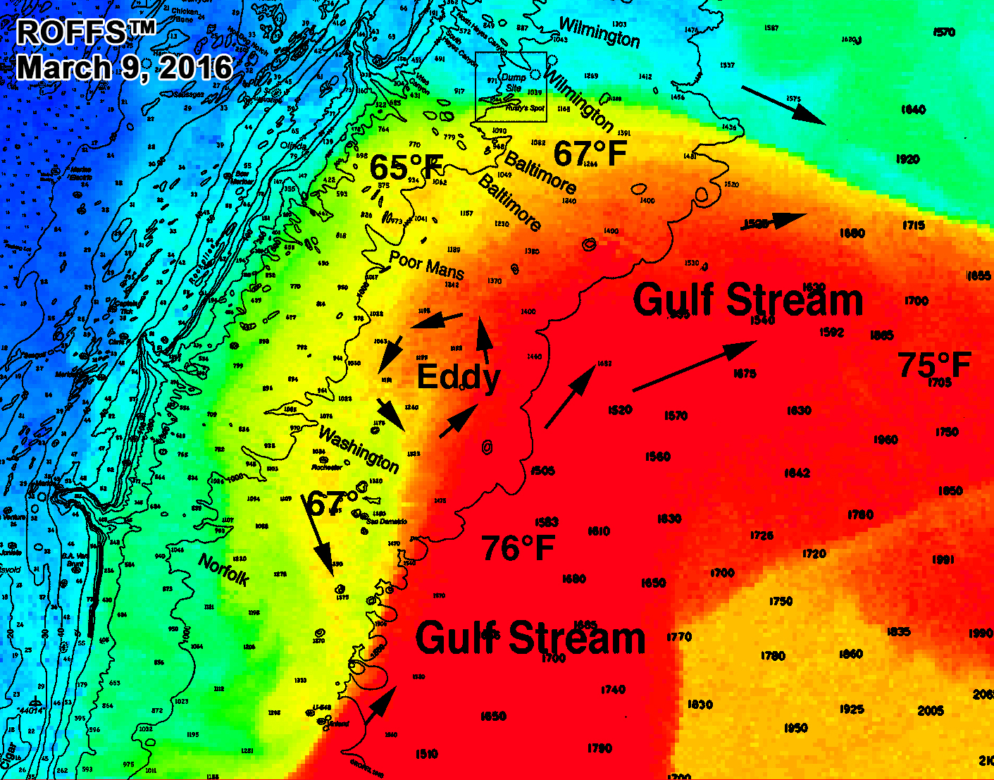 March 9, 2016 – A relatively small, counter-clockwise eddy has formed along the western side of a Gulf Stream meander and is pulling 65°-67°F blue water over the Baltimore Canyon to Washington Canyon. This is another reminder that the fishing season off New Jersey, Delaware and Maryland could start at any time now. While be believe that this feature will be short lived in these canyons, this water is headed to the eddy over the Hydrographer Canyon suggesting that more warm water and fish will be in that much larger, clockwise rotating eddy later this week or early next week.