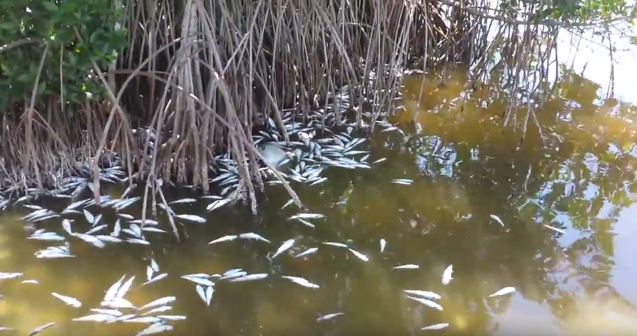 Above: Fish kill in the Banana River lagoon that happened over the weekend due to high nutrient levels feeding an ongoing brown algae bloom, that depleted the dissolved oxygen. Video Courtesy: cnc66 | YouTube