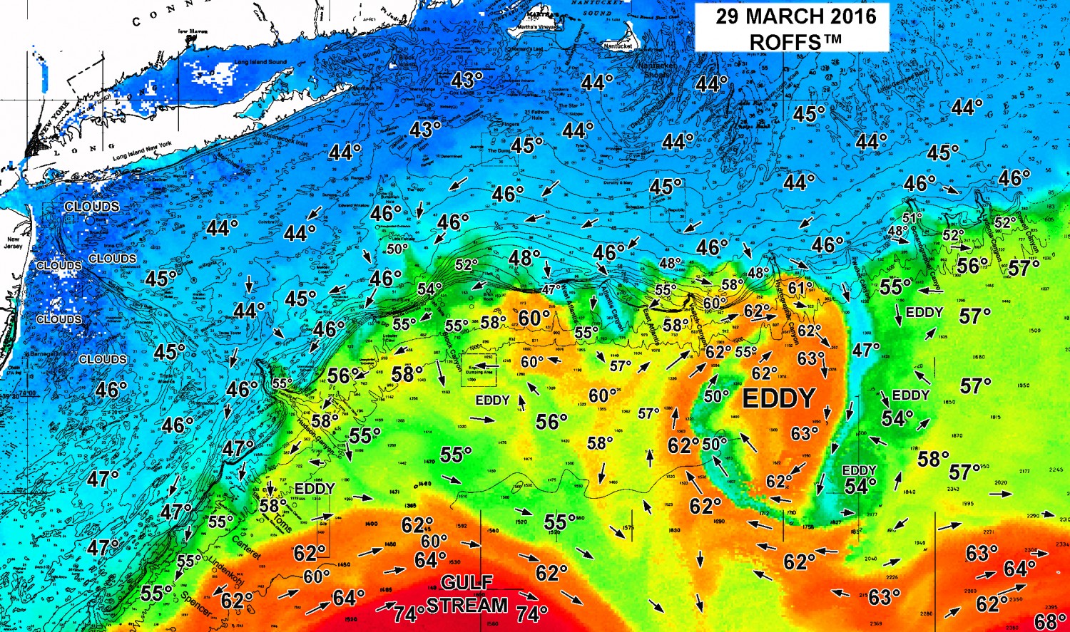We are providing another complimentary analysis of the overall ocean conditions from Tuesday, March 29th for the canyon areas offshore of Massachusetts, Rhode Island, Connecticut to New York and northern New Jersey to provide some motivation to get ready for the fishing season. We have included some spot sea surface temperatures (°F) and located the main eddy features with arrows indicating the flow direction of the water. Overall, we continue to monitor the large clockwise rotating Gulf Stream Warm Core Ring Eddy now centered south between Hydrographer and Veatch Canyon. Updating the conditions from earlier in March, we are encouraged that this large eddy has remained intact and continues to slowly move westward as it is now pushing mixed Gulf Stream (60°F-63°F) water directly into Veatch and Hydrographer Canyon. Furthermore, there is a large amount of 60°F water farther west over the 100-500 fathom ledges between West Atlantis Canyon and Block Canyon for some decent early season shark and bluefin tuna action. If this large Gulf Stream Warm Core Eddy continues on its path as we expect, it will be pushing Gulf Stream 60°F-65°F water directly into the Atlantis Canyons within the next couple of weeks, then will continue to move west-southwestward and be into the Fish Tails to Dip area by late April and May. Farther southeast, of note, is the proximity of the direct Gulf Stream related waters (60°F-62°F-64°F) to the 1000 fathom ledges of Spencer, Wilmington and Lindenkohl Canyons encouraging some early season fishing action as the main Gulf Stream waters have pushed farther north than normal for this area. Keep in mind, with this being a warmer than normal El Nino winter for the Northeast, it should also equate to an earlier than normal arrival for tuna, wahoo, dolphin and billfish action into this area. Therefore, get your boats ready, do not miss out on some early season tuna, shark and swordfish action. Contact ROFFS™ and get the up-to-date integrated fishing forecasting analysis to locate the best conditions for fishing action near you.