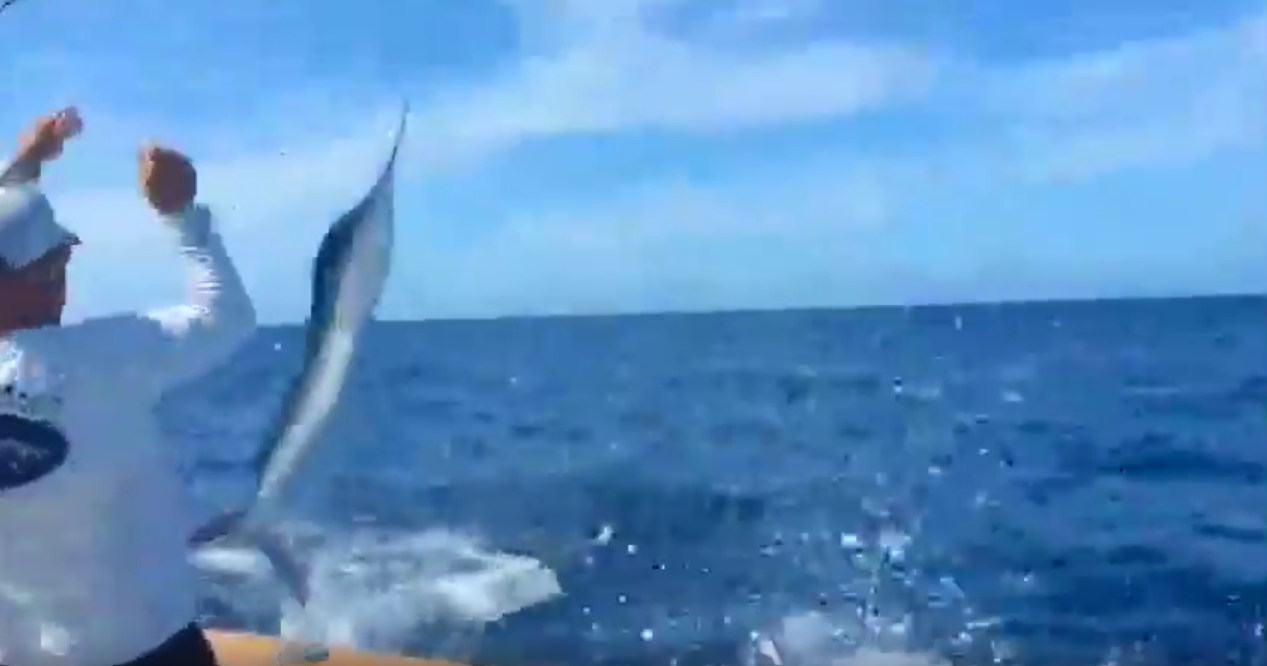 Video white marlin jumping in the boat.
