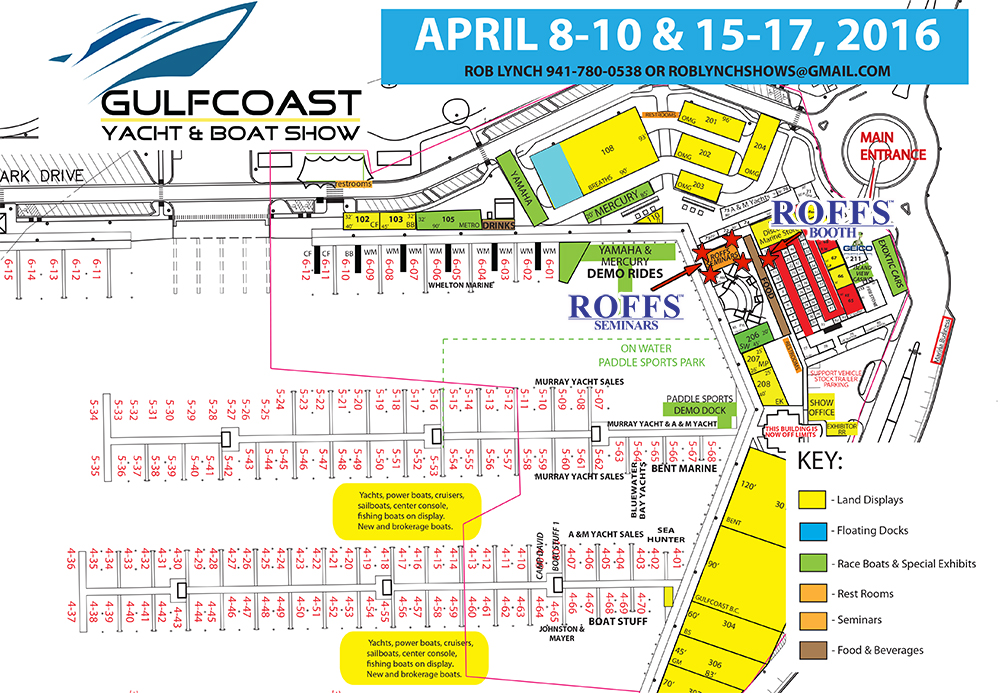 ROFFS™ will be exhibiting this year at the 2016 Gulfcoast Boat & Yacht Show! ROFFS™ will be participating, and presenting daily seminars at 2:00 pm in the ROFFS™ Seminar Tent (map below) on the topic Effects of the Ocean Environment (including eddies) on the Catchability of Tuna, Marlin, Sharks and Mahi at the 2016 Gulfcoast Yacht and Boat Show in Gulfport, MS both this weekend and next weekend Friday, Saturday & Sunday! The show will be held in Gulfport, MS both this weekend April 8th, 9th and 10th (Friday through Sunday) and again next weekend on April 15th, 16th and 17th (Friday through Sunday). At our seminars we will also be discussing background information on how and why fish search for their preferred waters.