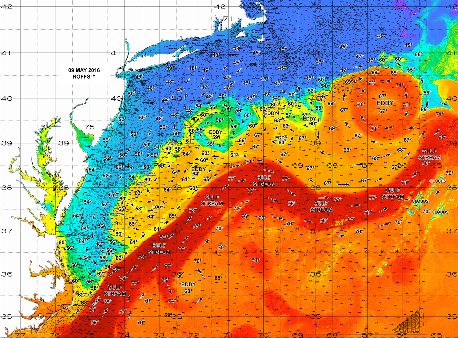 Tuna are offshore right now! Therefore we are providing another complimentary analysis of the overview of the ocean conditions during the week of May 9th to remind you that you cannot catch fish sitting at the dock waiting to read about it from social media. We are again focusing on the northeast offshore region from Cape Hatteras to Virginia, New Jersey, New York to Massachusetts including all offshore canyons to provide some motivation to get offshore. We have included some spot sea surface temperatures (°F) of the main water masses and have located the main eddy features with arrows indicating the flow direction of the water. Bottom line is, although some of the waters appear a bit cool for an abundance of yellowfin tuna, we have already been receiving early reports of yellowfin, bluefin and bigeye tunas being caught and spotted in the 60°F to 64°F waters along with mako, thresher and blue sharks. So contact ROFFS™ now and get the up-to-date integrated fishing forecasting analysis to locate the best fishing conditions near you.