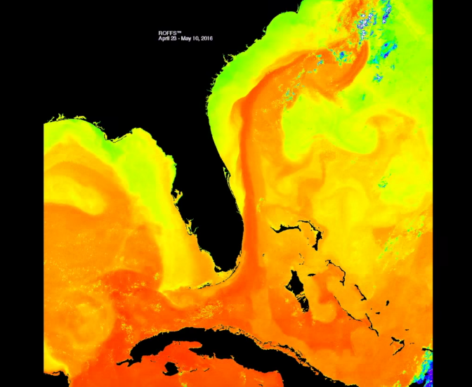 Above: Reduced resolution Infrared imagery from the period April 23-May 10, 2016 showing the flow of the water based on the signature temperature of the water masses. Some days were removed due to cloud interference.