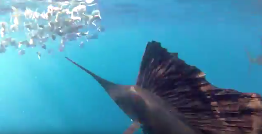 They are members of the billfish family, and as such, have an upper jaw that juts out well beyond their lower jaw and forms a distinctive spear. They are found near the ocean surface usually far from land feeding on schools of smaller fish like sardines and anchovies, which they often shepherd with their sails, making them easy prey. They also feast on squid and octopus.