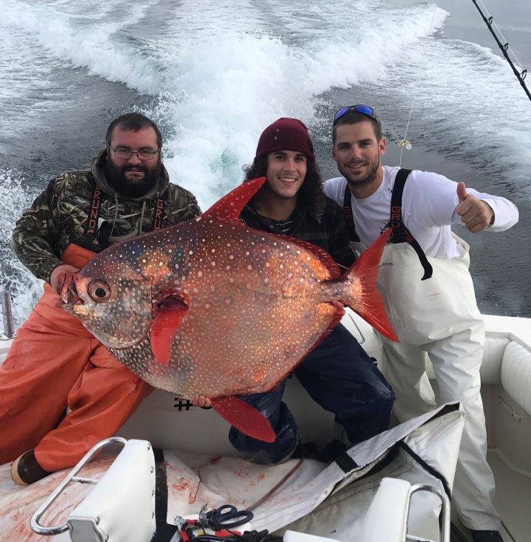 Ensor reeled in a 105-pound opah on Sunday. The fish, also known as a moonfish, typically is found in tropical waters. It is also the only known warm-blooded fish, giving it an advantage as a predator in the depths of the ocean.