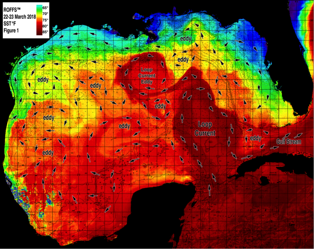 Based on what we have been observing over the last several weeks, the present ocean conditions for the Gulf of Mexico region continue to look excellent with warmer water over much of the typical fishing zones within the Gulf of Mexico early this season. The presence of both the Loop Current and favorable blue water features (eddies) will continue to keep the warmer water within these fishing zones allowing the already favorable fishing conditions to continue through the summer. Overall, we think that the Gulf of Mexico conditions for spring to early summer are EXCELLENT so it is definitely time to start fishing and call ROFFS™ for the latest and greatest updates.