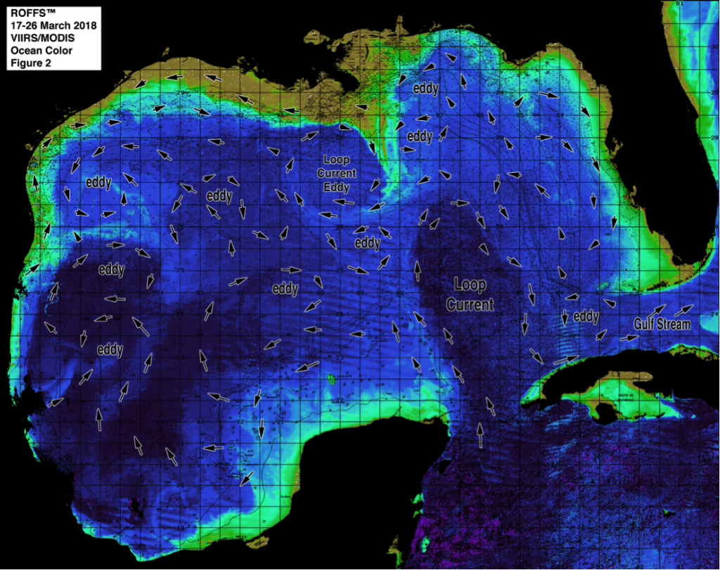 ROFFS™ (roffs.com) has a 30+ year history of monitoring the ocean conditions throughout the Gulf of Mexico for research and fishing applications. Infrared (IR) satellite data is used to observe the SST and ocean color data is used to derive indices of phytoplankton (chlorophyll), water clarity, and colorized dissolved organic material (CDOM). Combined with other oceanographic data and in sequence, these data allows one to visualize the dynamic ocean currents. The satellite data is derived from a variety of sources including NASA, NOAA, Suomi National Polar-orbiting Partnership (SNPP), the University of Delaware and the European Space Agency (ESA). ROFFS™ also incorporates a variety of different data derived from drifting buoys, gliders, aircraft, fishing vessels, and satellite altimeters into its fishing forecasting analyses. The altimeter data provides a relatively coarse spatial (~15 mile) and temporal resolution (5-10 days) that limits the data’s usage for studying large-scale circulation. It is not useful for evaluating smaller scale and short-term (daily and sub-daily) changes in the ocean currents or their water mass boundaries that control the location of forage fish and the larger, more valuable predator fish.