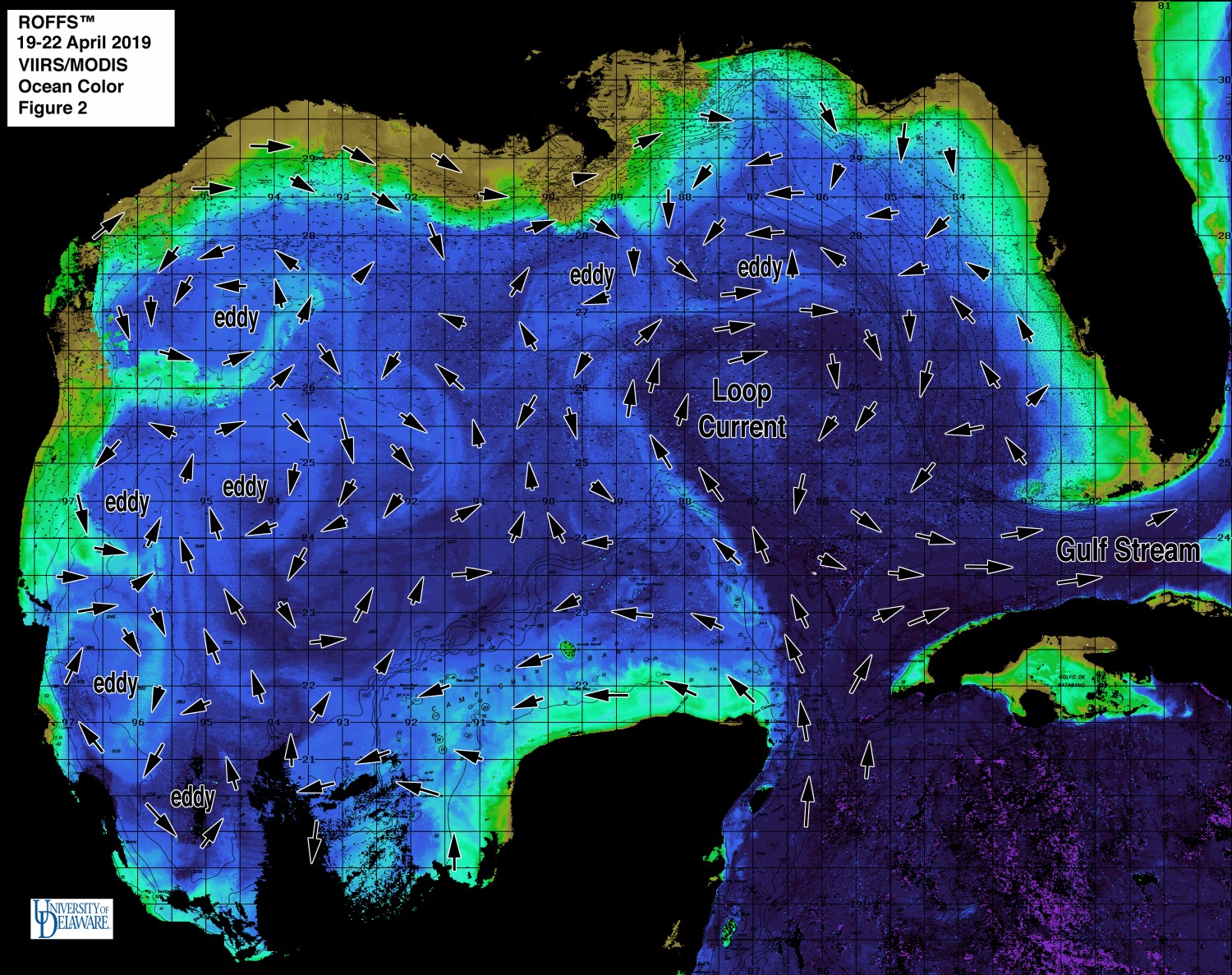 ROFFS™ (roffs.com) has a 30+ year history of monitoring the ocean conditions throughout the Gulf of Mexico for research and fishing applications. Infrared (IR) satellite data is used to observe the SST and ocean color data is used to derive indices of phytoplankton (chlorophyll), water clarity, and colorized dissolved organic material (CDOM). Combined with other oceanographic data and in sequence, these data allows one to visualize the dynamic ocean currents. The satellite data is derived from a variety of sources including NASA, NOAA, Suomi National Polar-orbiting Partnership (SNPP), the University of Delaware and the European Space Agency (ESA). ROFFS™ also incorporates a variety of different data derived from drifting buoys, gliders, aircraft, fishing vessels, and satellite altimeters into its fishing forecasting analyses. The altimeter data provides a relatively coarse spatial (~15 mile) and temporal resolution (5-10 days) that limits the data’s usage for studying large-scale circulation. It is not useful for evaluating smaller scale and short-term (daily and sub-daily) changes in the ocean currents or their water mass boundaries that control the location of forage fish and the larger, more valuable predator fish.