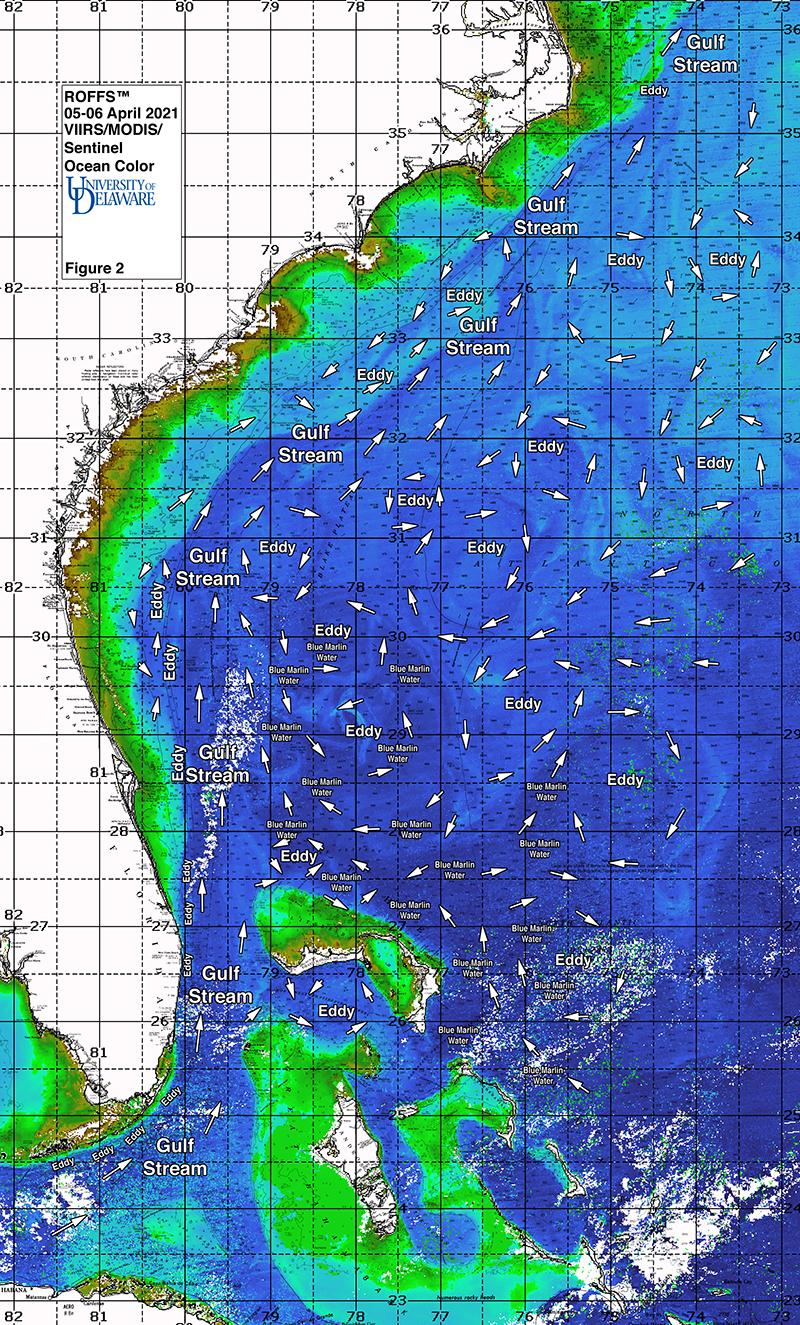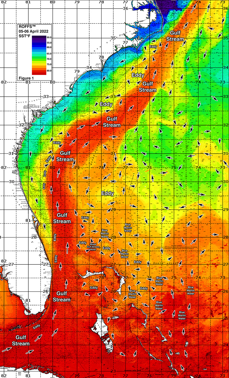 ROFFS™ continues its spring preview series by providing an overall update of the oceanographic conditions during early April for the east coast of the United States from the Florida Keys north to Cape Hatteras, NC including the entire offshore Gulf Stream region. As always, we have used a combination of many different data sets, but mainly sea surface temperature (SST) and ocean color/chlorophyll images.  We will discuss these overall ocean conditions for the present spring season and how these conditions may translate to the near future fishing season.