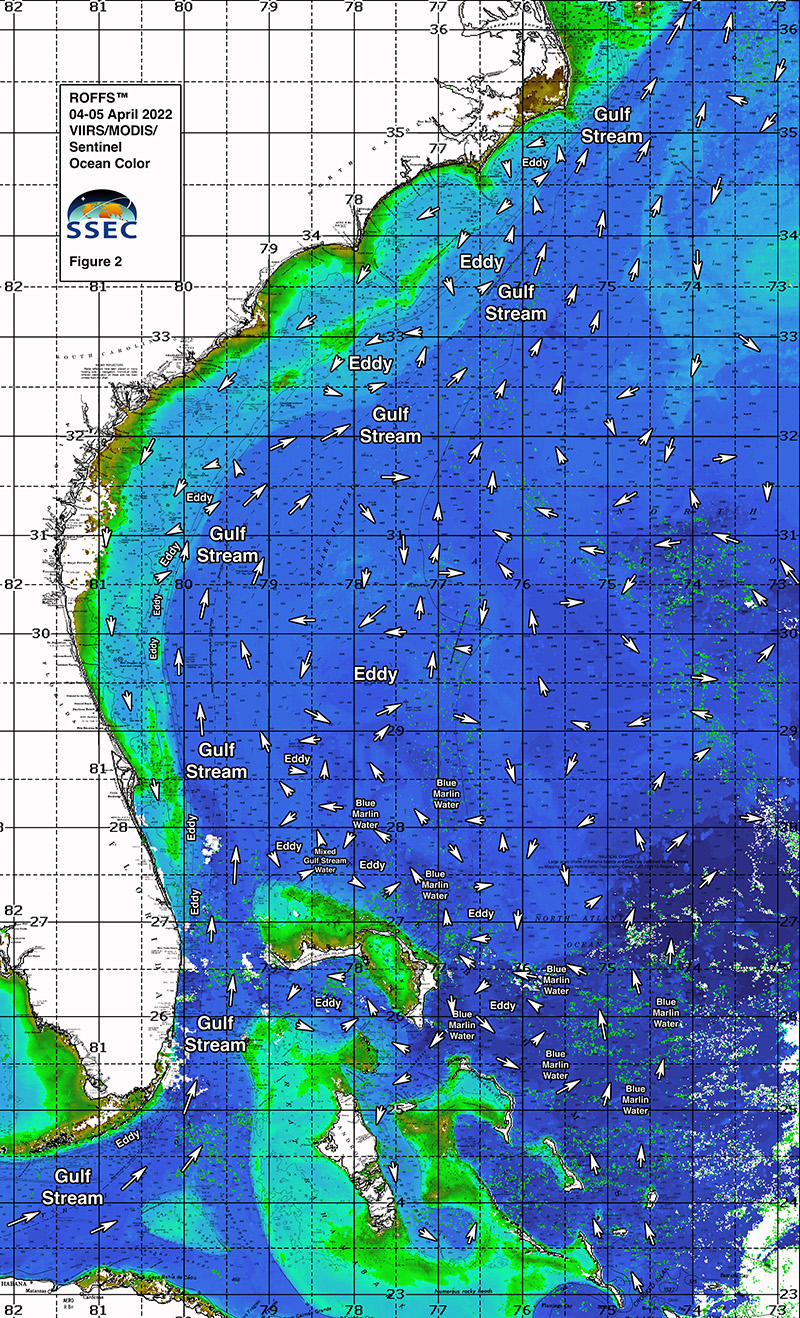 For forecasting short-term oceanographic conditions related to finding fish, ROFFS™ uses real-time direct observations rather than unproven ocean models and longer-term composites. We have learned that evaluating the pre-season conditions, along with regional climate models, provides insight into future seasonal trends for fishing. Experience and understanding of the ocean – atmospheric dynamics is our guide as we have had moderate success in forecasting seasonal trends of fishing productivity based on the stepwise progression in the location of the fishes’ preferred habitat, based on temperature and water color.  Please reference our 2022 Bahamas forecast for more in-depth discussion on the environmental and climate indicators that goes into our detailed evaluation of the southeastern United States fishing forecasting analysis (Click Here).