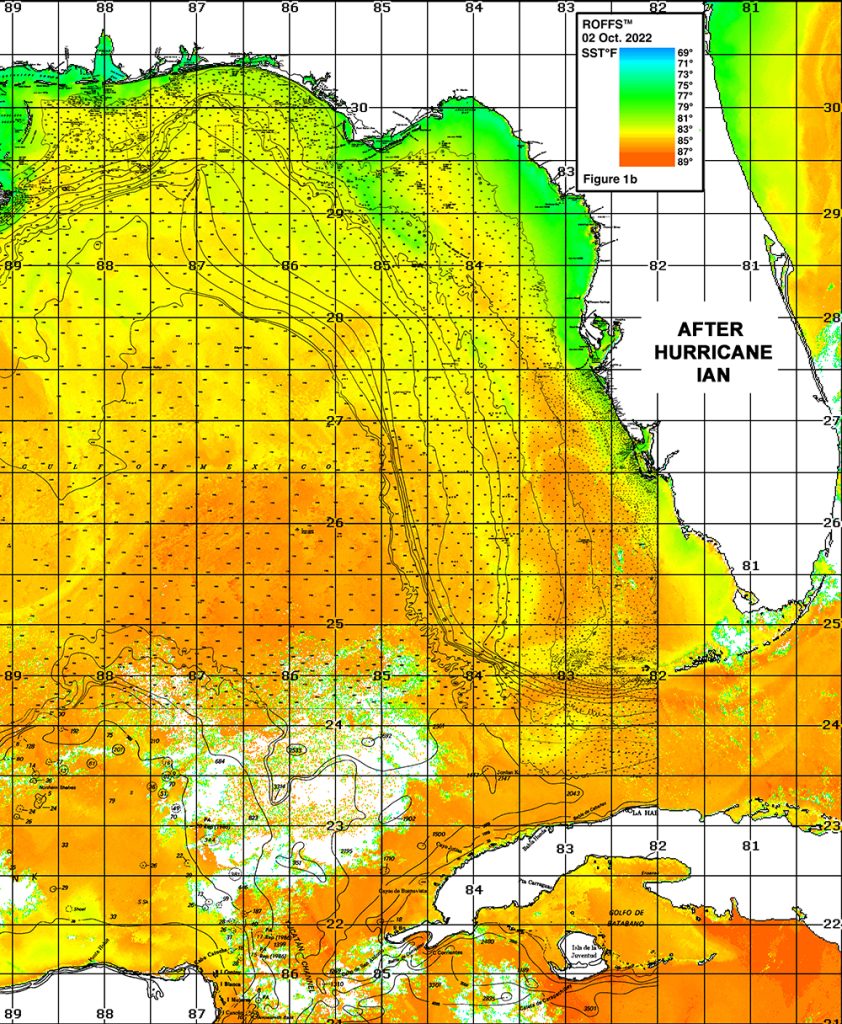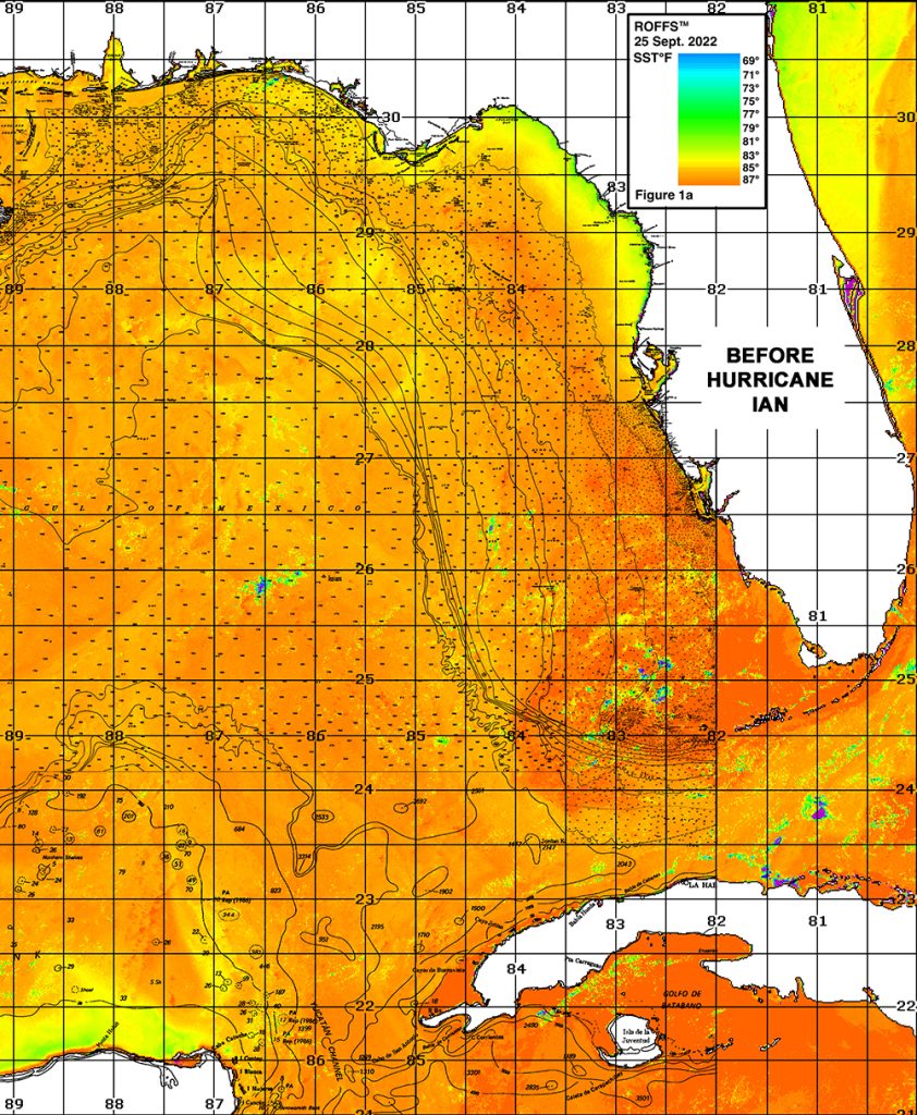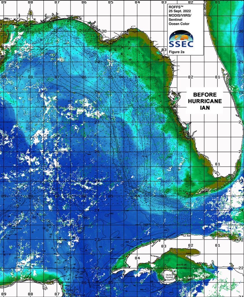 Using ROFFS™ high-resolution infrared sea surface temperature (SST) and MODIS, VIIRS, and Sentinel ocean color/chlorophyll satellite composite imagery we were able to observe large scale changes to the oceanographic conditions due to Hurricane Ian’s impact in the eastern Gulf of Mexico. We were able to observe a dramatic decrease in sea surface temperature throughout the eastern Gulf of Mexico, most notably along the coastal areas, as well as the inshore areas between Cape Canaveral and Savannah, Georgia. Additionally, we observed an increase in turbid green to blue green water inshore due to ocean mixing and runoff that pushed bluer water further offshore to the west and northwest towards the areas offshore of Tampa, over the Florida Middle Grounds and towards the area south of the Florida Panhandle. Some of this green to blue green water was also pulled offshore near the Marquesas into the Florida Straits towards the areas south of the Florida Keys. Our thoughts go out to those impacted by Hurricane Ian in late September.