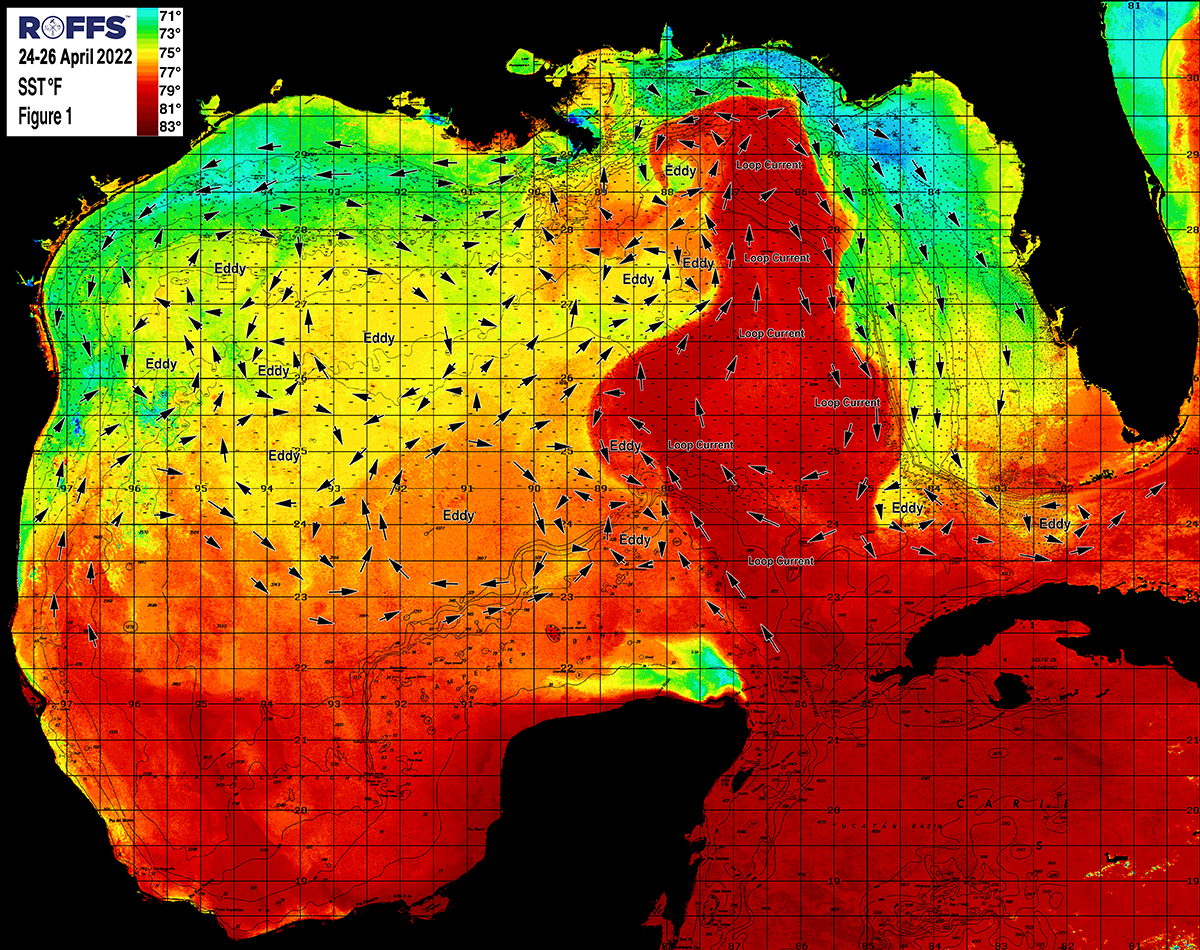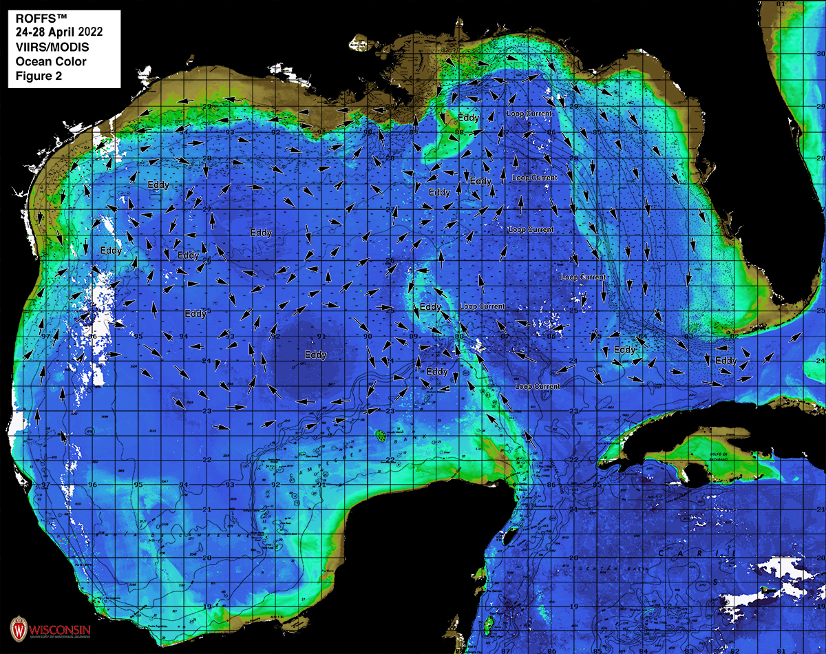 Contact ROFFS™ (321-723-5759 / fishing@old.roffs.com / www.roffs.com) for daily real-time detailed fishing forecasting analyses and get the inside track to where the better conditions will be tomorrow or while you are out fishing. We continue to monitor the Gulf of Mexico conditions and how they change from day-to-day as the recreational fishing season has arrived and the bigger tournament fishing season is arriving soon. The bottom line is: GET PREPARED and GET OFFSHORE NOW and take advantage of the weather windows, for the favorable spring season fishing conditions have already started and should continue to improve through May and into the summer months.