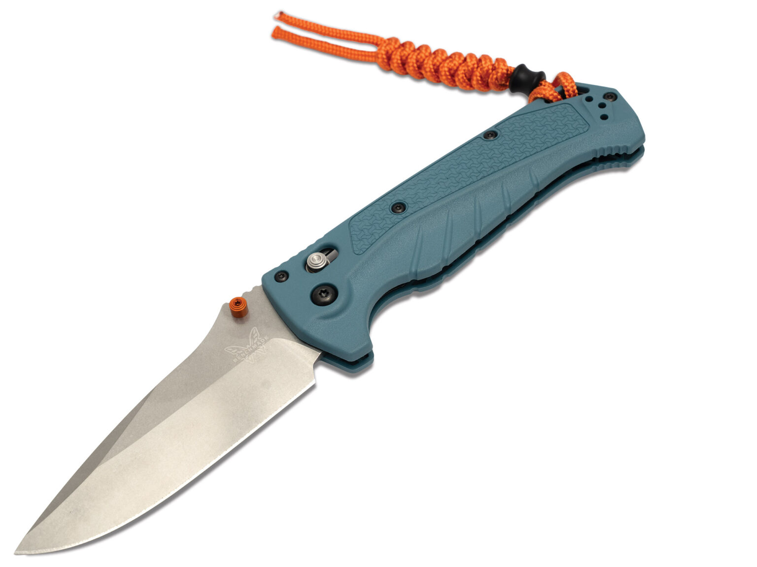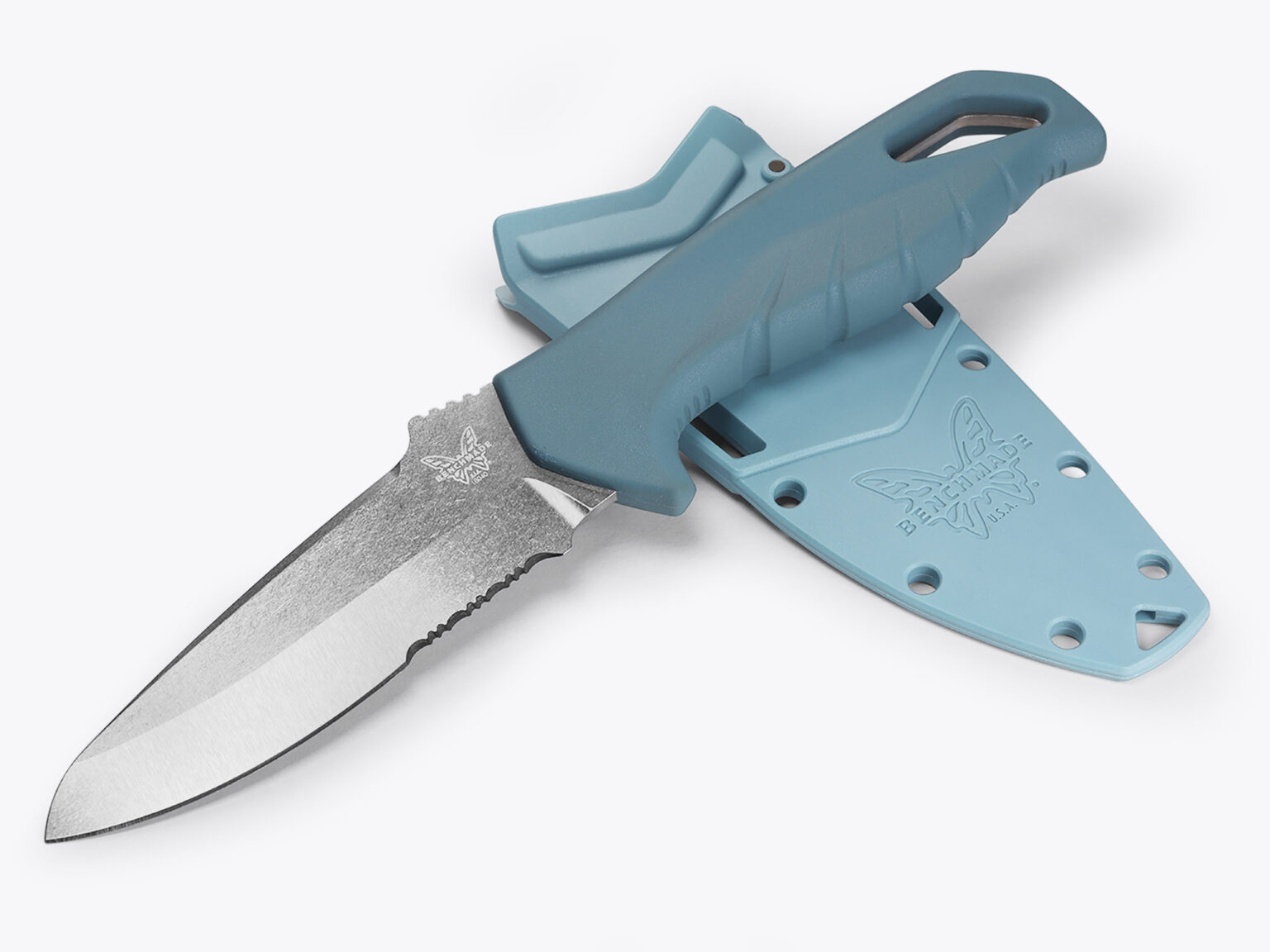 There are two models of Benchmade’s Undercurrent. One of them has a drop-point blade and the other has a sheepsfoot blade with partial serration. We tested the sheepsfoot model and really liked it. If you don’t need a piercing tip, the blunt point of a sheepsfoot is a safer option to avoid stabbing someone when bouncing around in a boat. This fixed-blade comes with a handy push-button sheath that can be mounted to a belt, pack or leaning post. With a total length of about 9.5 inches, it’s a bait-chunking machine, and the serrated portion of the blade rips through wet rope easily.