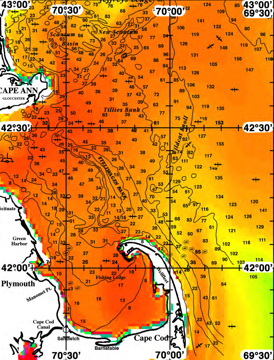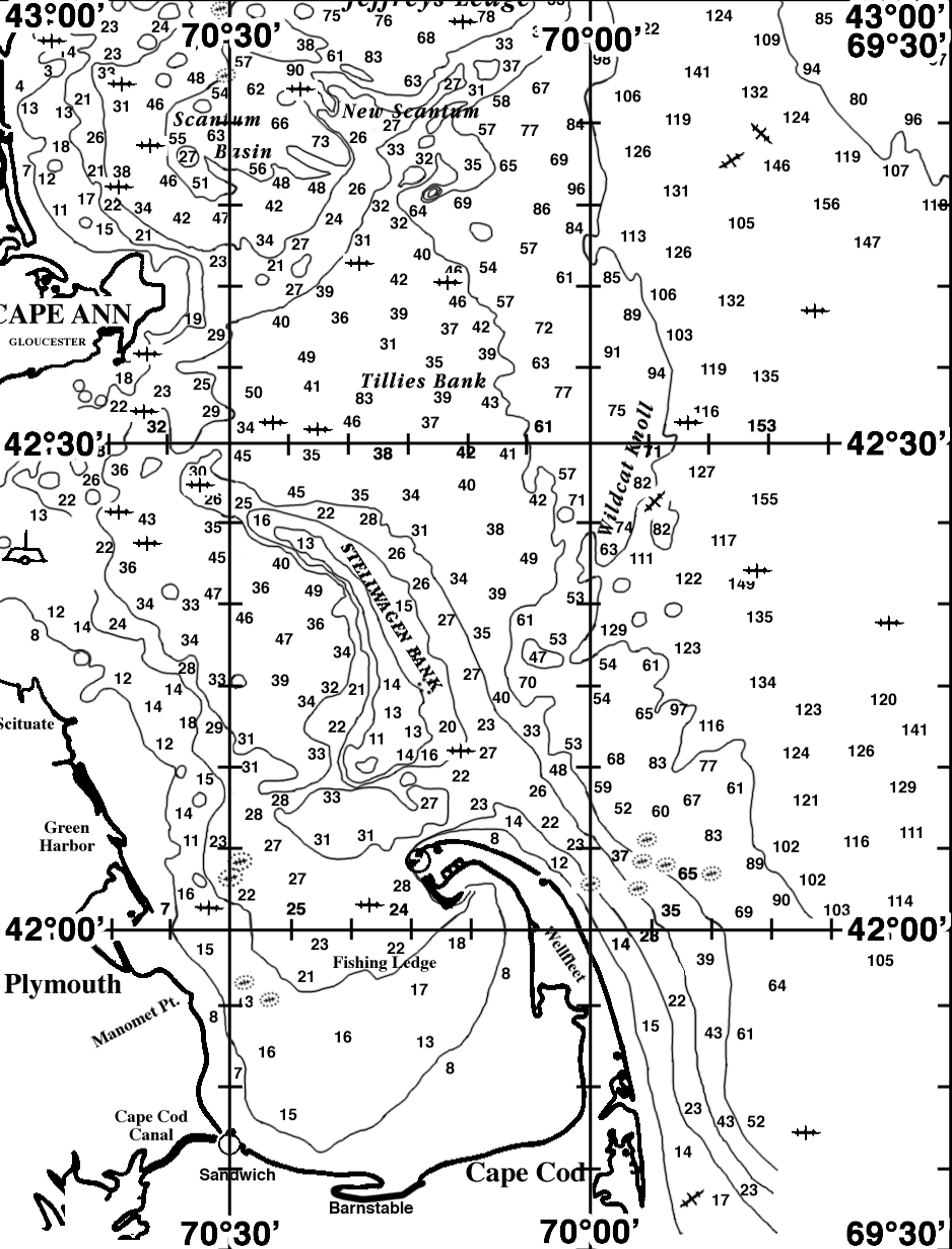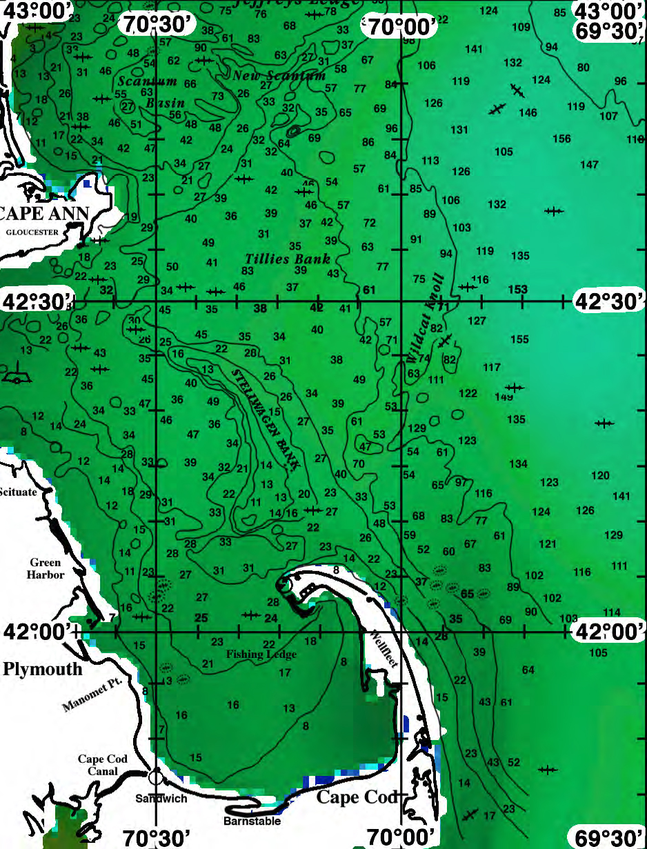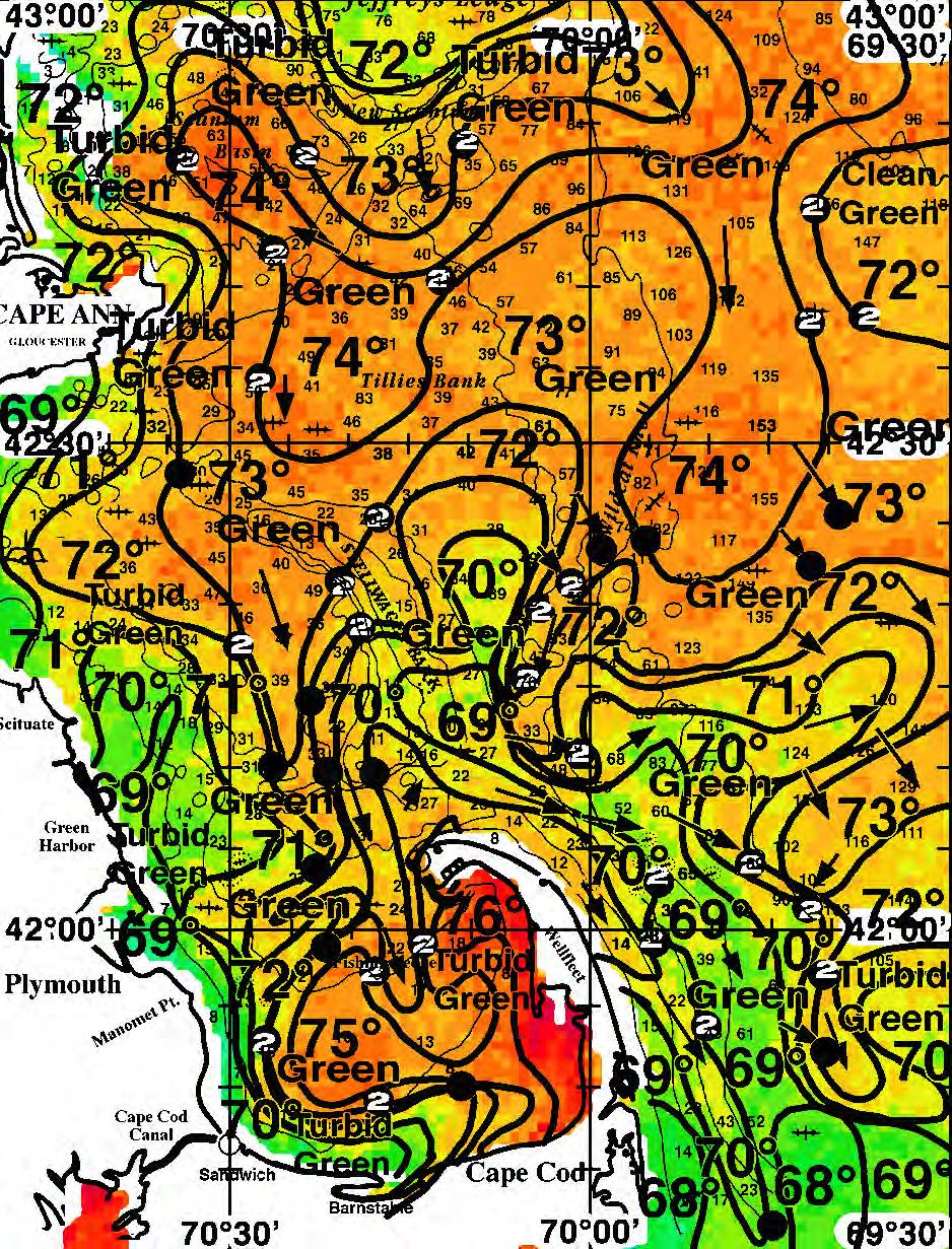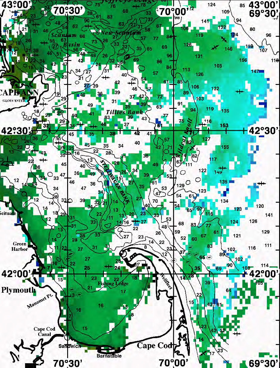Areas of Interest: Cape Ann, Gloucester, Scituate, Green Harbor, Plymouth, Monomet Pt., Cape Cod Canal, Sandwich, Barnstable, Cape Cod, Wellfleet, Scantum Basin, New Scantum, Tillies Bank, Stellwagen Bank, Wildcat Knoll, Fishing Ledge Common Inlets: Cape Cod, Falmouth (NH), Gloucester (MA), Marblehead (MA), Merrimac River (MA), Orleans (MA), Plymouth (MA), Portsmouth (NH), Scituate (MA)Download Analysis Sample (PDF)