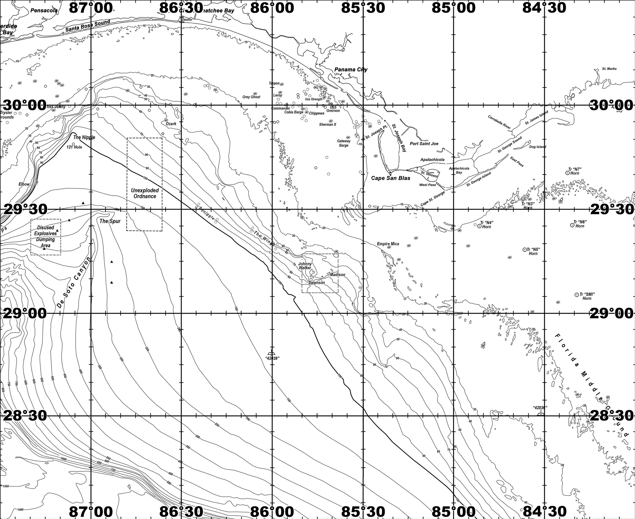 Areas of Interest: Tower "N7" Horn, Tower "N6" Horn, Tower "SMI" Horn, Florida Middle Grounds, Tower "N3" Horn, Tower "N4" Horn, Tower "N5" Horn, "42036" Buoy, Empire Mica, Tarpon, Leroy, Commander, Cobia Barge, USS Strength, Chippewa, USS Grierson, Sherman X, Gateway Barge, The Wings, Johnny Walker, Swanson, Madison, "42039" Buoy, Grey Ghost, Squiggle, Ozark, Unexploded Ordnance, The Spur, Miss Jenny, Trysler Grounds, The Nipple, 131 Hole, Elbow, Disused Explosives Dumping Area, De Soto Canyon, Buffalo Barge, Alabama Alps, Petronius, Neptune Spar, Marlin TLP, The Steps, Double Nipple, Fink Dome, Appomattox, Nor Goliath, Spirit, Virgo, Ram Powell, Dorsey/Sounder Canyon, Horn Dome, Horn Mountain, West Neptune, 960 Hill/Tuna Mountain, Dauphin Dome, Heron's Mound, Rowan Resolute, Pacific Sharav, Blind Faith, Curfew Mound, Grand Gosier Mound Common Inlets: Apalachicola, Biloxi, Cape San Blas, Carrabelle (FL), Destin (FL), Gulfport (MS), Mexico Beach (FL), Mobile (AL), Orange Beach, Panama City (FL), Pensacola, Perdido Pass, Port St. Joe (FL), St. George Island (FL)