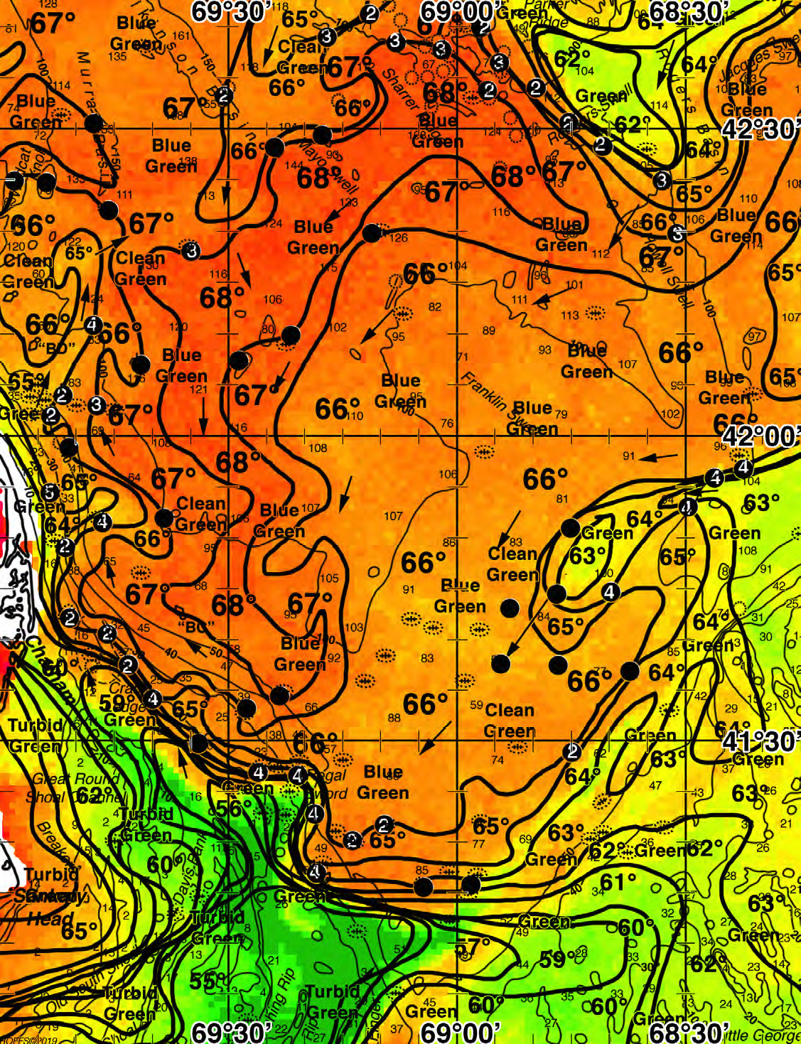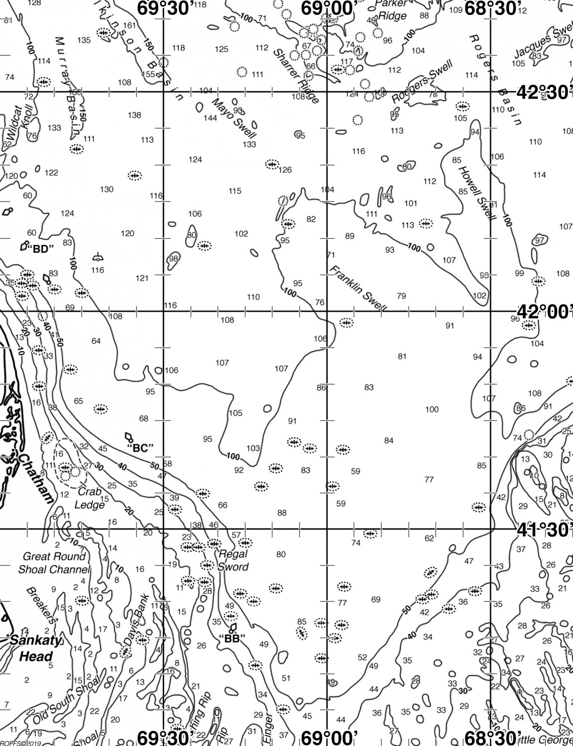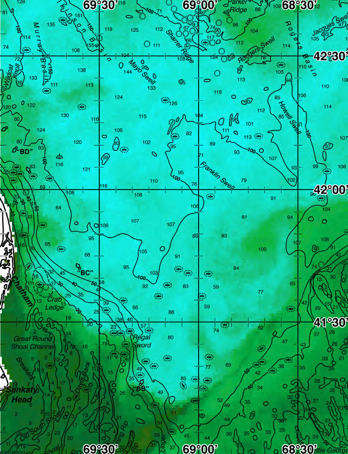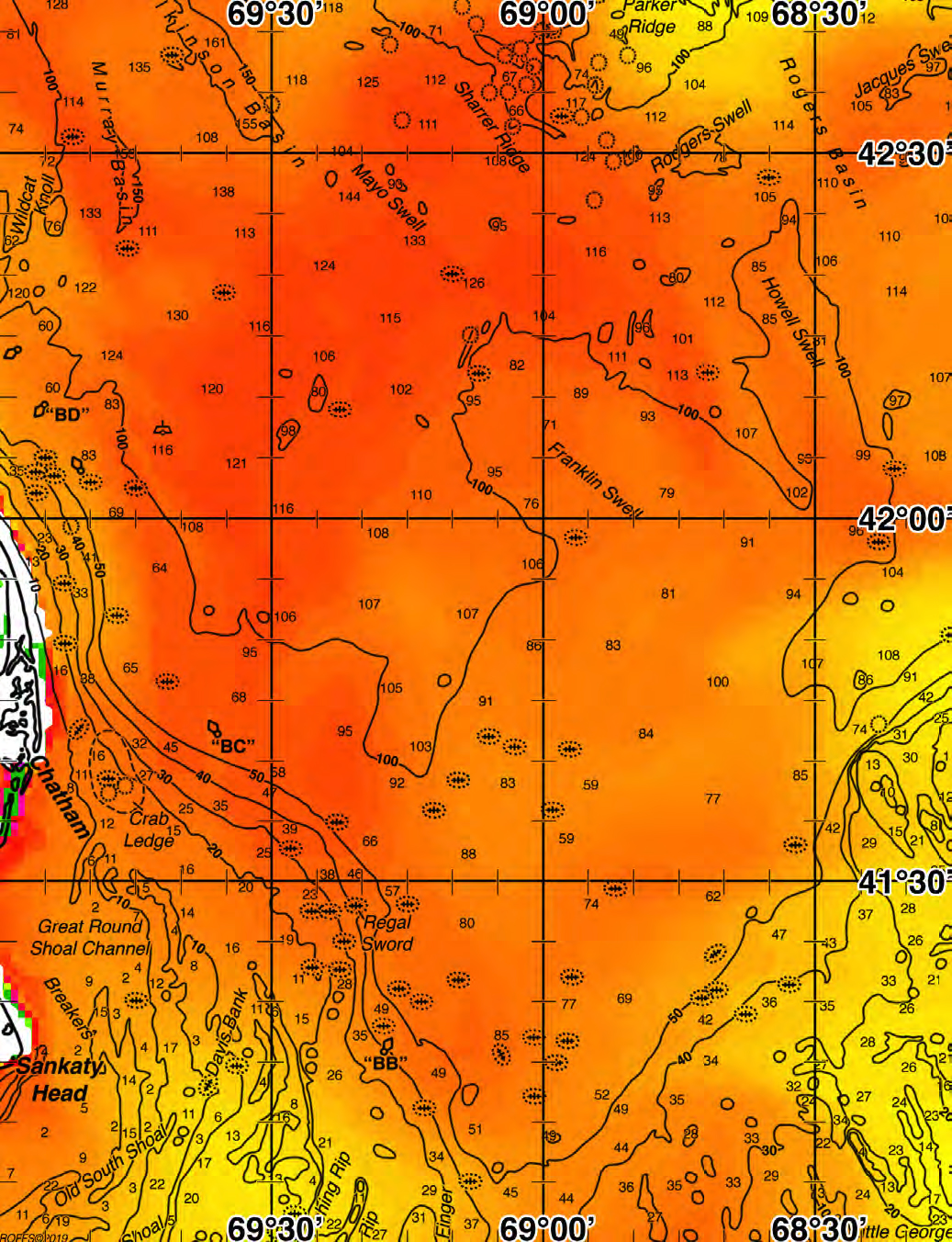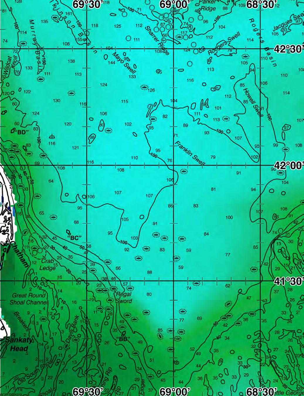 Areas of Interest: Wildcat Knoll, Murray Basin, Wilkinson Basin, Mayo Shoal, Sharrer Ridge, Parker Ridge, Rodgers Swell, Rogers Basin, Jacques Swell, "BD" Buoy, Franklin Swell, Howell Swell, Chatham, "BD" Buoy, Crab Ledge, Great Round Shoal Channel, Sankaty Head, Old South Shoal, Davis Bank, Regal Sword, "BB" Buoy Common Inlets: Chatham, NantucketDownload Analysis Sample (PDF)