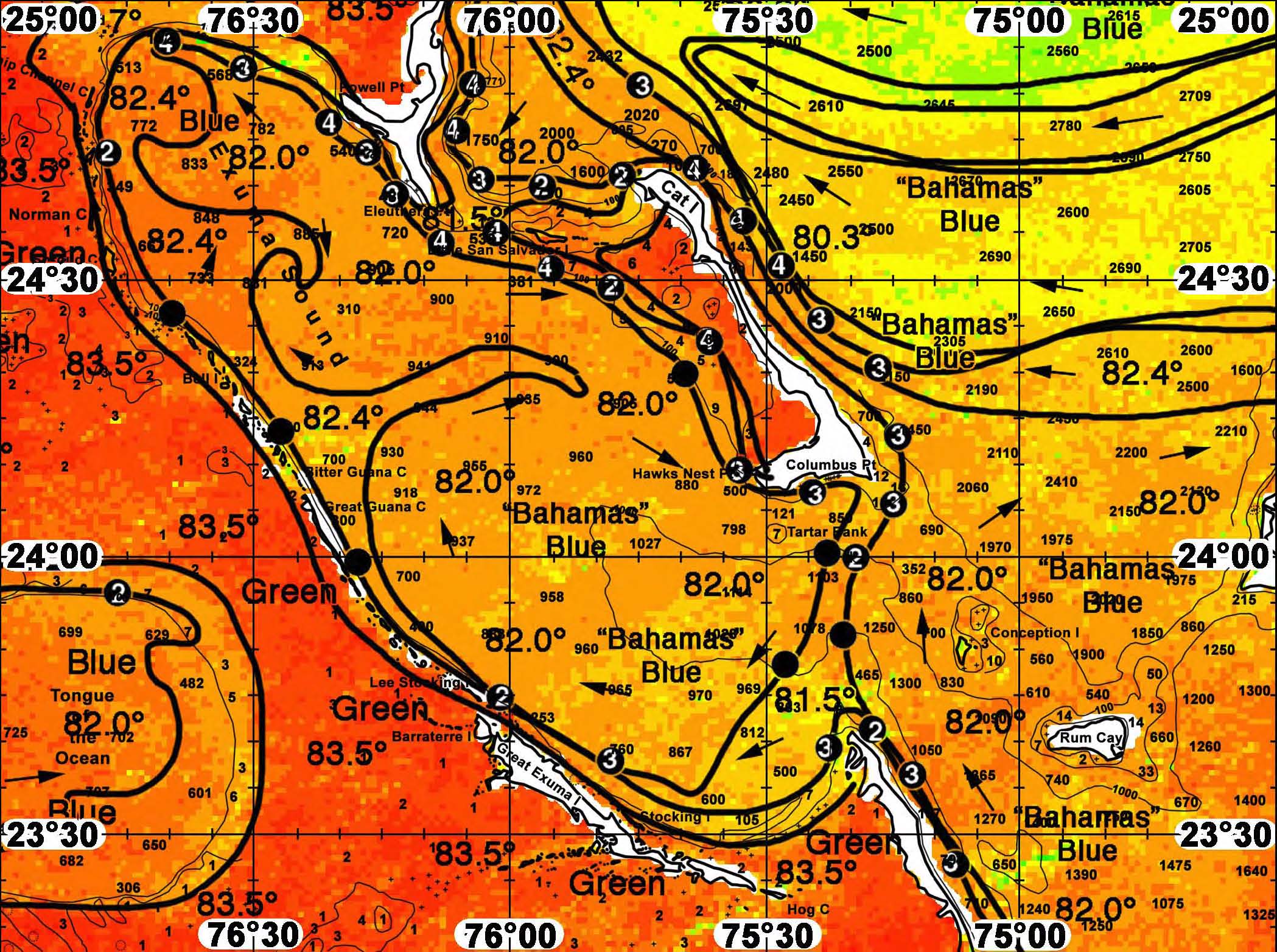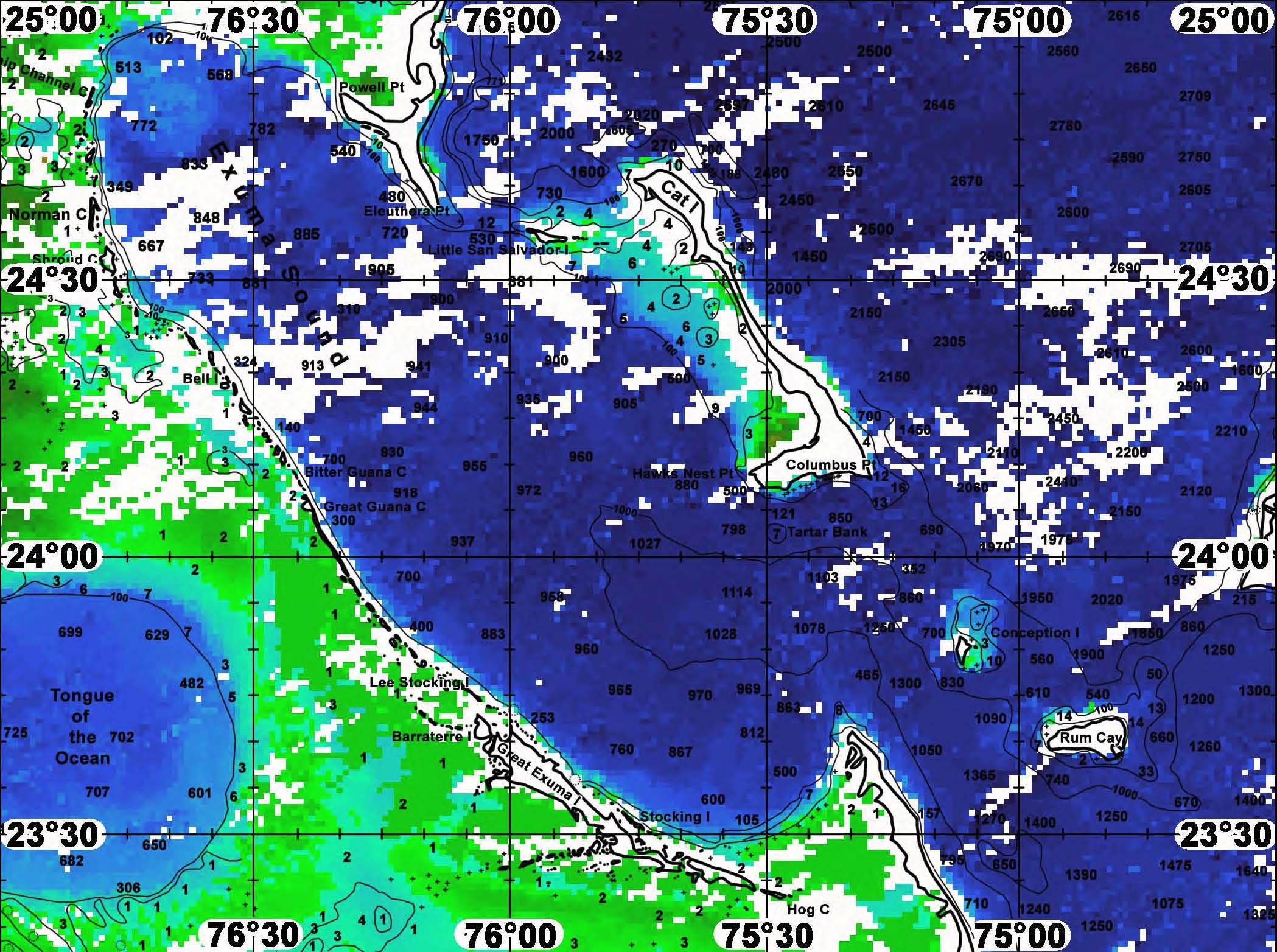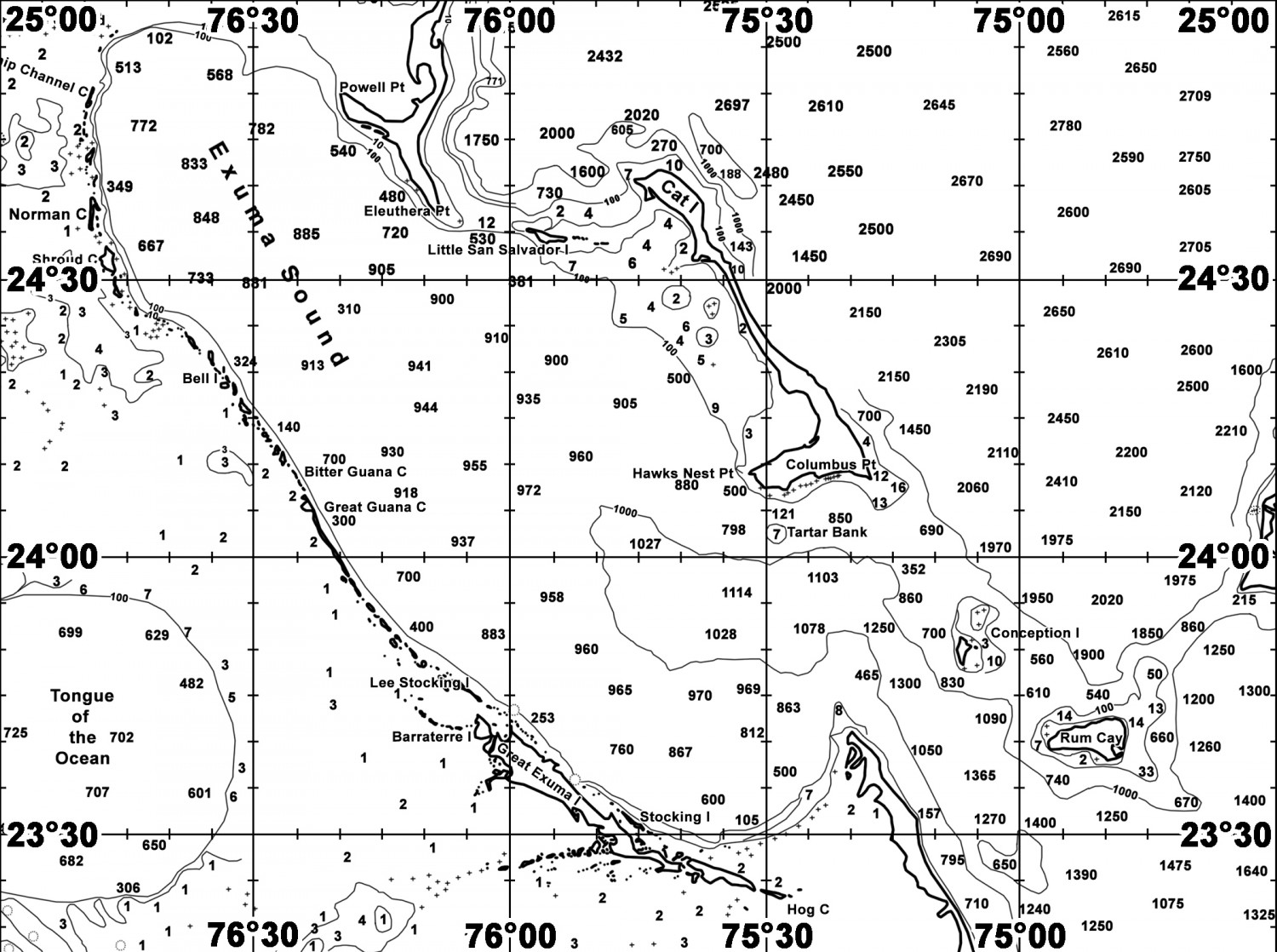 Areas of Interest: Exuma Sound, Eleuthera Point, Hawk's Nest Point, Tartar Bank, Columbus Point, Tongue of the Ocean, Lee Stocking Island, Conception Island, Rum Cay Common Inlets: Cat Island, Emerald Bay (Bahamas), Exuma Sound, Hawk's Nest (Cat Island), Rum Cay, San Salvador