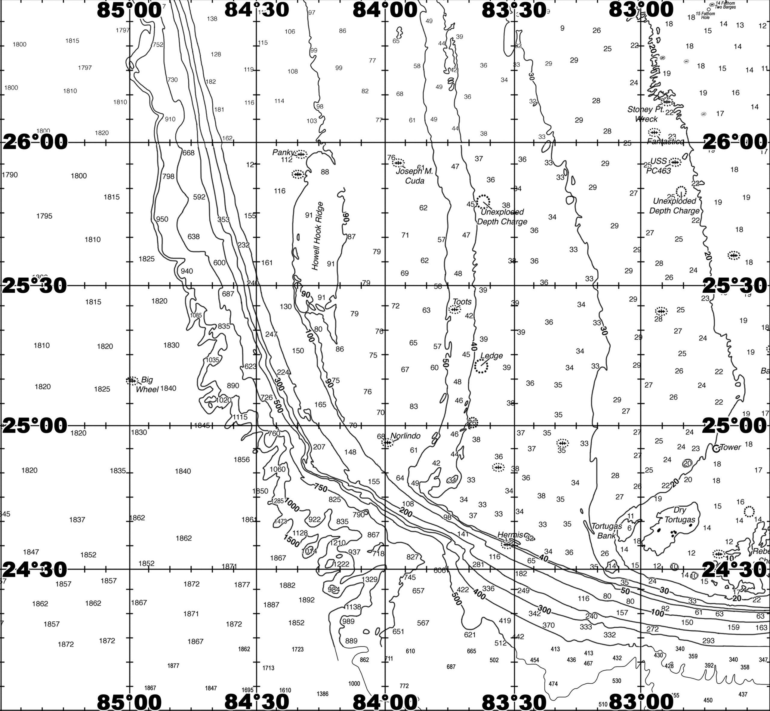 Areas of Interest: Vernon Basin, Artemis, Pegasus Tug, Stoney Pt Wreck, Fantastico, Panky, Howell Hook Ridge, Joseph M. Cuda, Unexploded Depth Charge, USS PC463, Panama Jack, Big Wheel, Toots, Ledge, Baja California, Norlindo, Hermis, Tortugas Bank, Dry Tortugas, Rebecca Shoals Common Inlets: Anna Maria Island, Boca Grande Inlet, Bradenton (FL), Cape Coral (FL), Captiva Pass, Clearwater, Fort Myers, Gordon Pass, John's Pass (FL), Key West, Marathon, Marco Island, Naples, Pass-a-Grille (FL), Saint Petersburg, Sarasota, Tampa, Venice (FL)Download Analysis Sample (PDF)