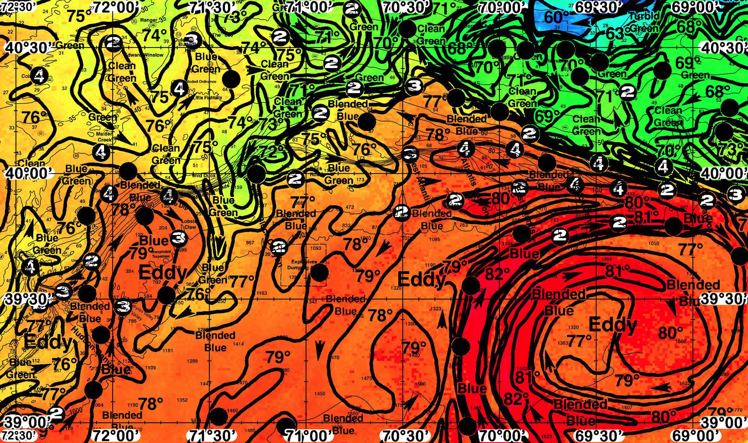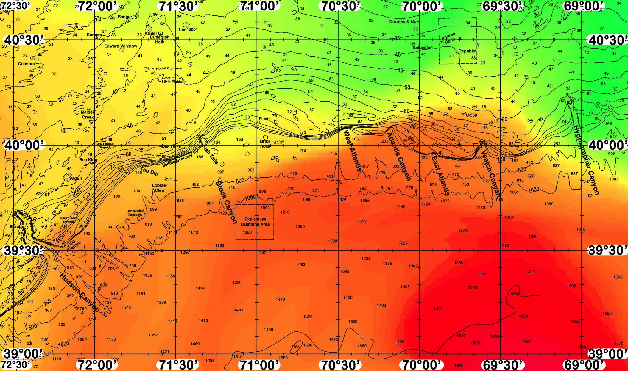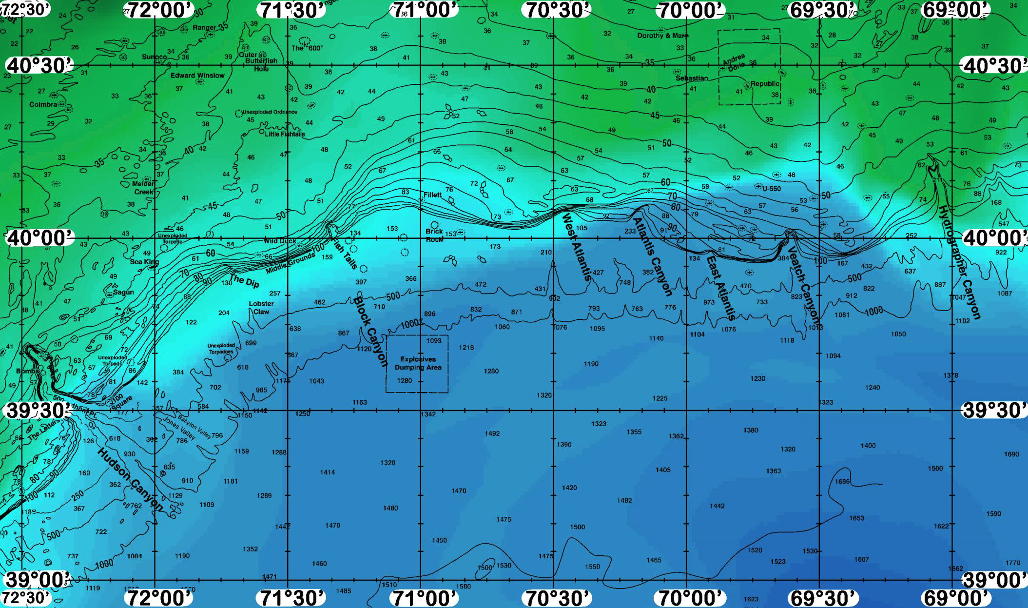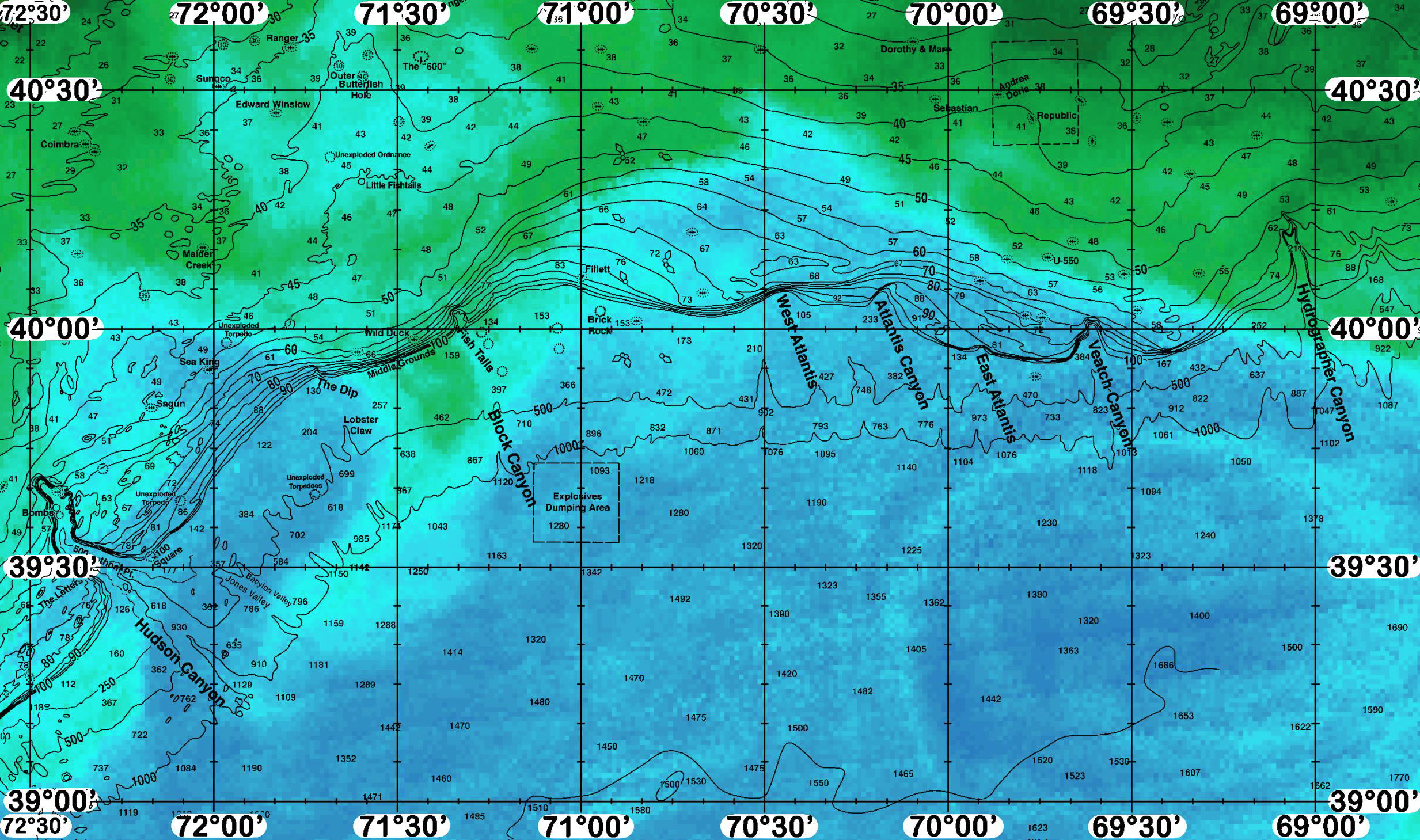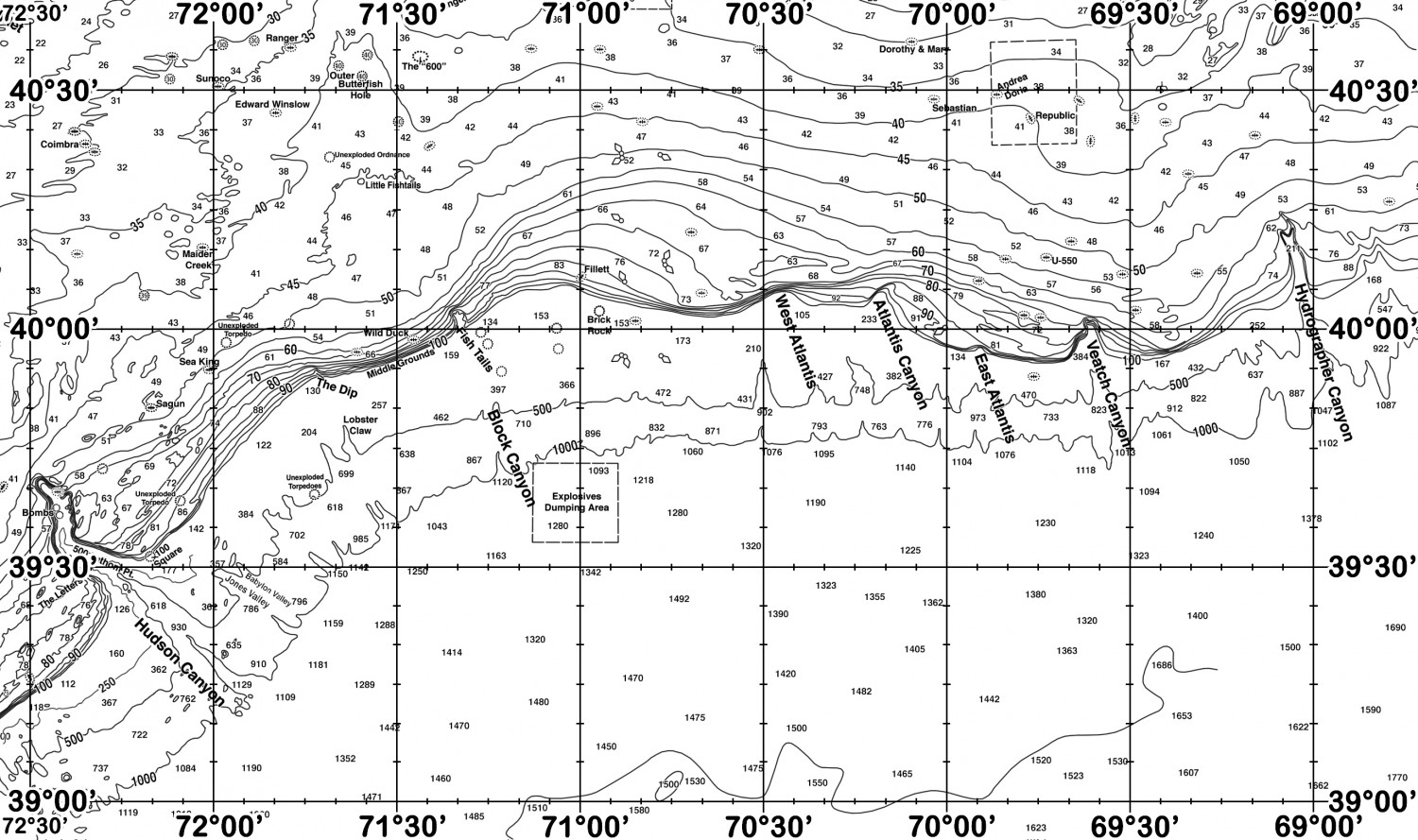 Areas of Interest: Coimbra, Ranger, Sunoco, Edward Winslow, Outer Butterfish Hole, The “600”, Maiden Creek, Unexploded Ordnance, Little Fishtails, Fish Tails, Wild Duck, Middle Grounds, The Dip, Block Canyon, Explosives Dumping Area, Lobster Claw, Unexploded Torpedoes, Sea King, Sagun, Babylon Valley, Jones Valley, 100 Square, Bombs, 500 Fathom Pt, The Letters, Hudson Canyon, Fillett, Brick Rock, Dorothy & Mary, Sebastian, Andrea Doria, Republic, U-550, West Atlantis Canyon, Atlantis Canyon, East Atlantis Canyon, Veatch Canyon, Hydrographer Canyon