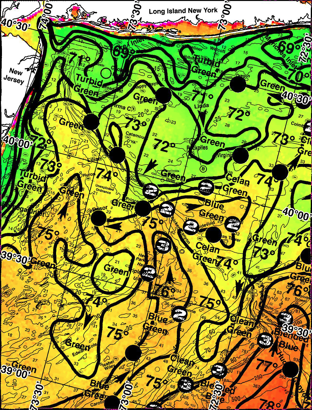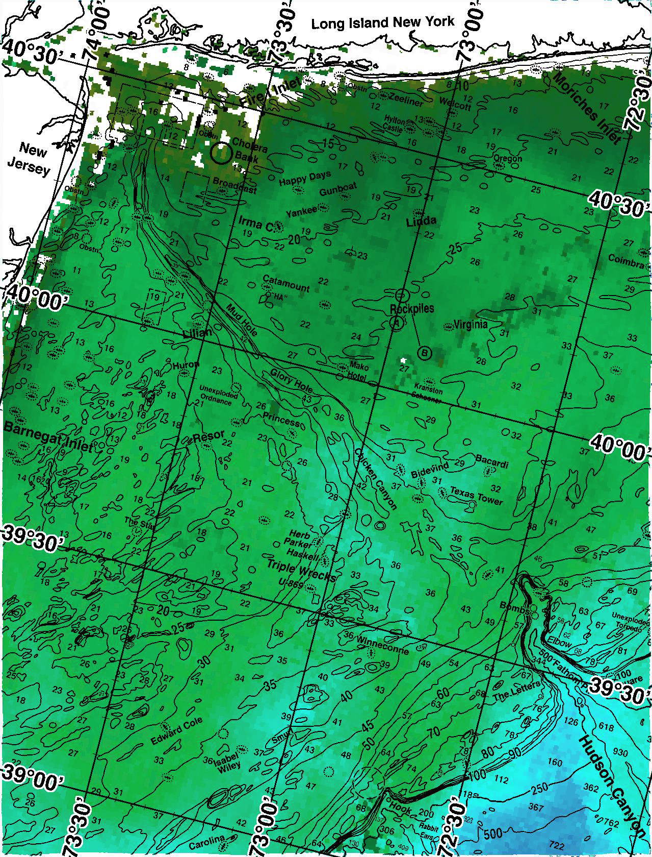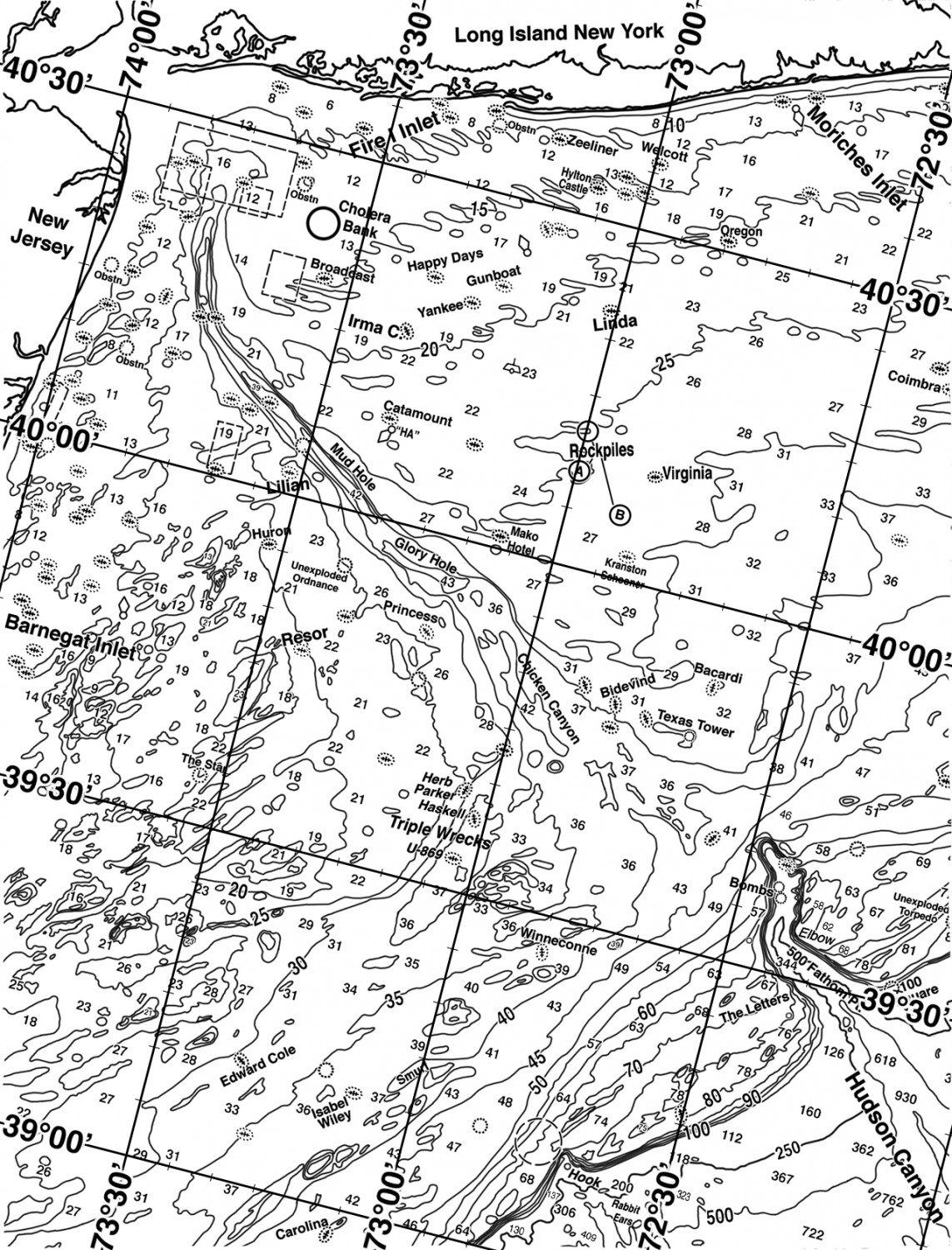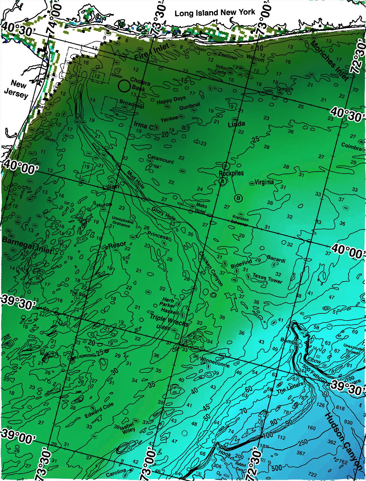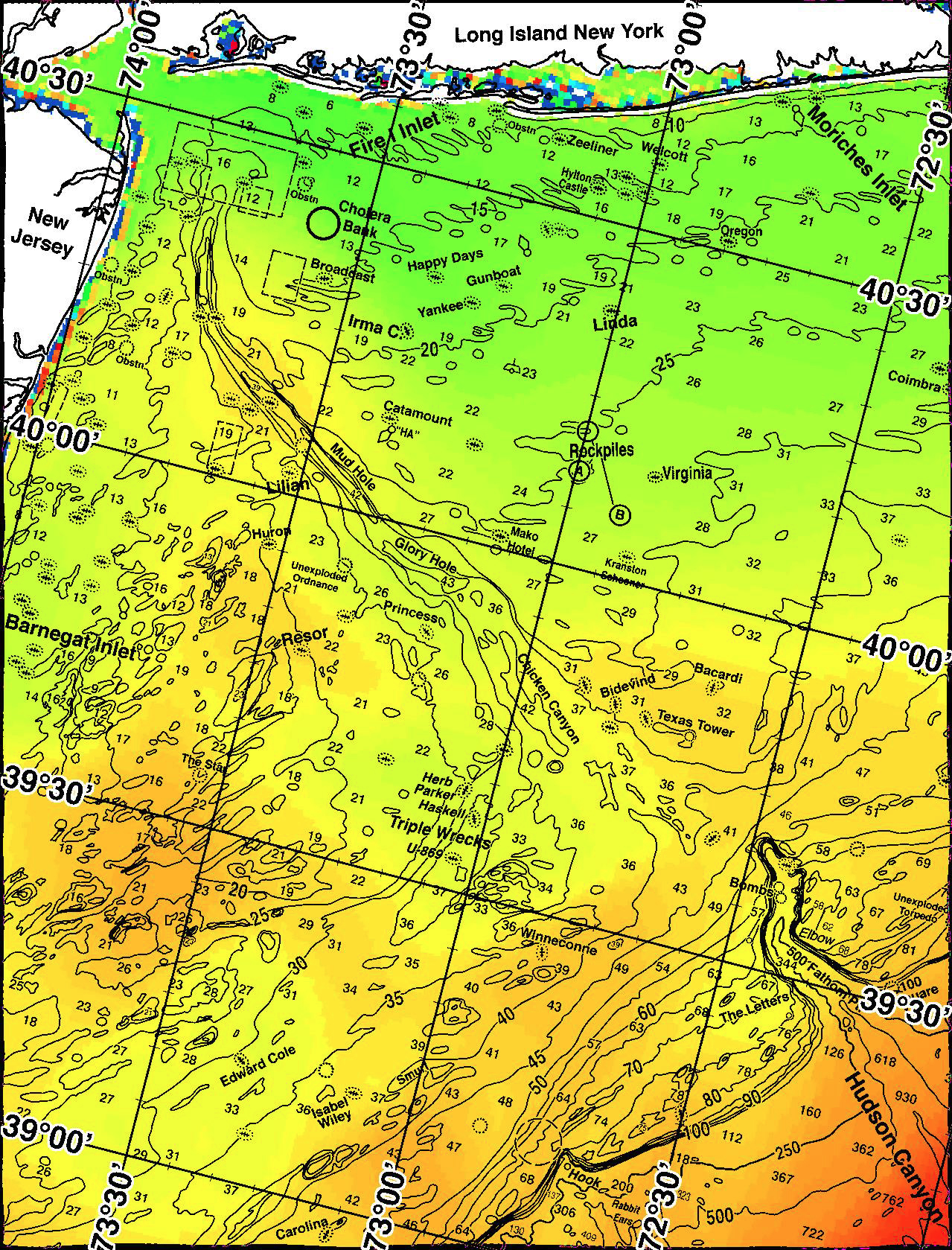 Areas of Interest: Cholera Bank, Broadcast, Zeeliner, Welcott, Hylton Castle, Oregon, Lilian, Mud Hole, Irma C, Catamount, Happy Days, Yankee, Gunboat, Mako Hotel, Linda, Rockpiles, Virginia, Coimbra, Kranston Schooner, Huron, Unexploded Ordnance, Glory Hole, Resor, Princess, Chicken Canyon, Bidevind, Bacardi, Texas Tower, Edward Cole, Isabel Wiley, Carolina, Smurf, Herb Parker, Haskell, Triple Wrecks, U-869, Winneconne, Bombs, Unexploded Torpedo, Elbow, 100 Square, 500 Fathom Pt, The Letters, Hudson Canyon, Hook, Rabbit Ears, Toms Canyon Common Inlets: Barnegat Inlet (NJ), Belmar, Cape May (NJ), Fire Island (NY), Freeport (NY), Great Egg Inlet, Jones Inlet (NY), Manasquan Inlet, Montauk (NY), New York Harbor, Point Pleasant (NJ), Rockaway (NY), Sandy Hook (NJ), Shark River, Townsend InletDownload Analysis Sample (PDF) - Lat./Long.