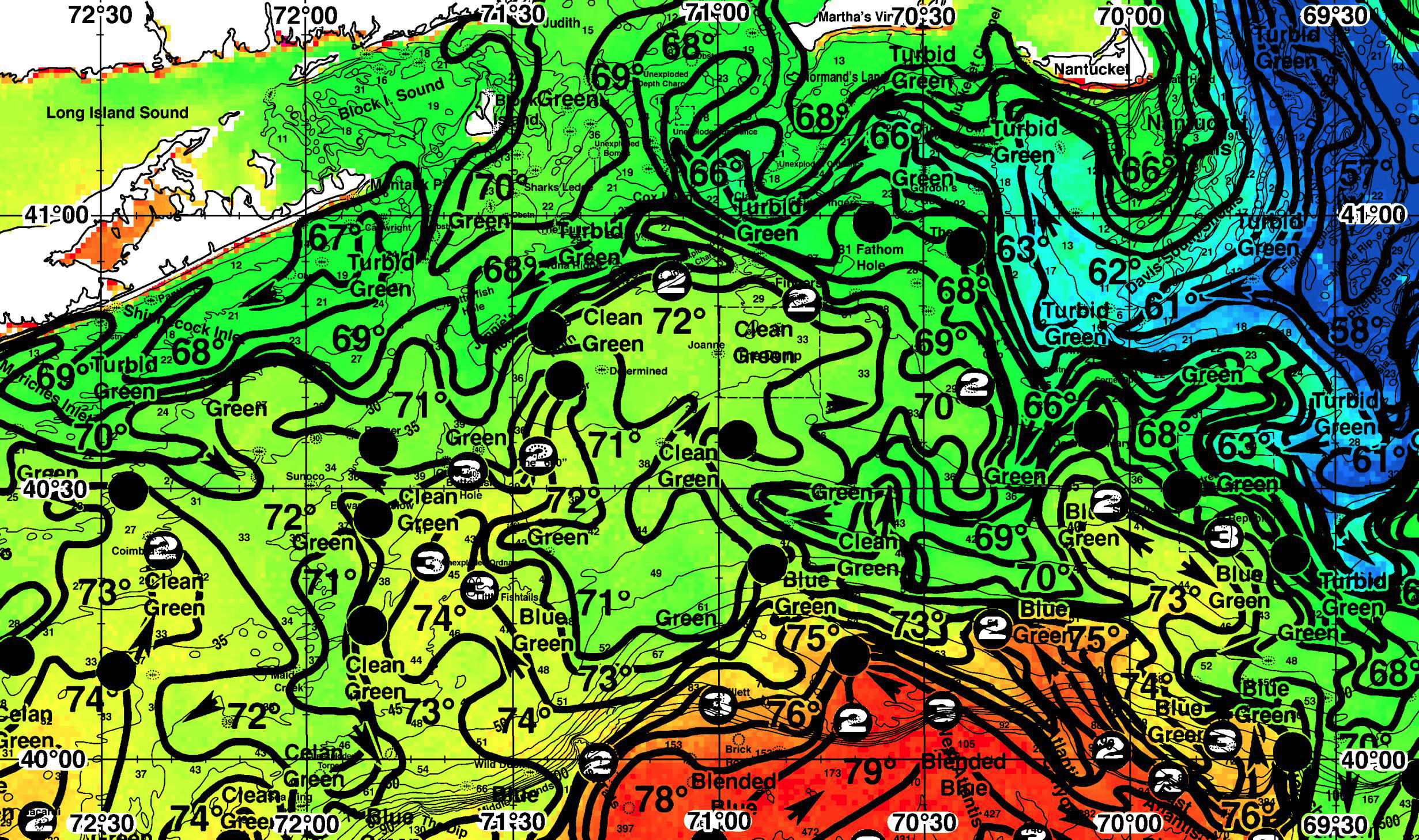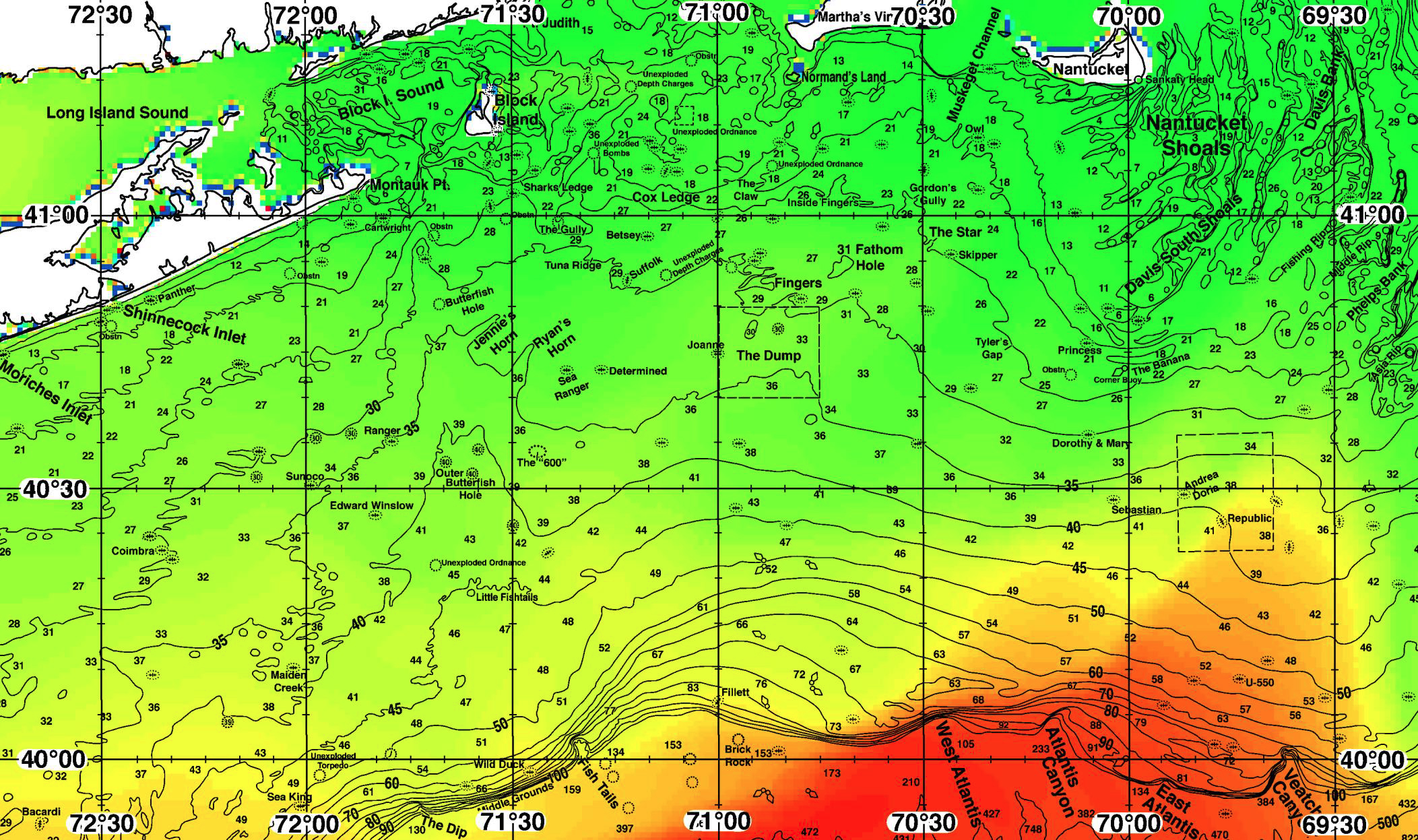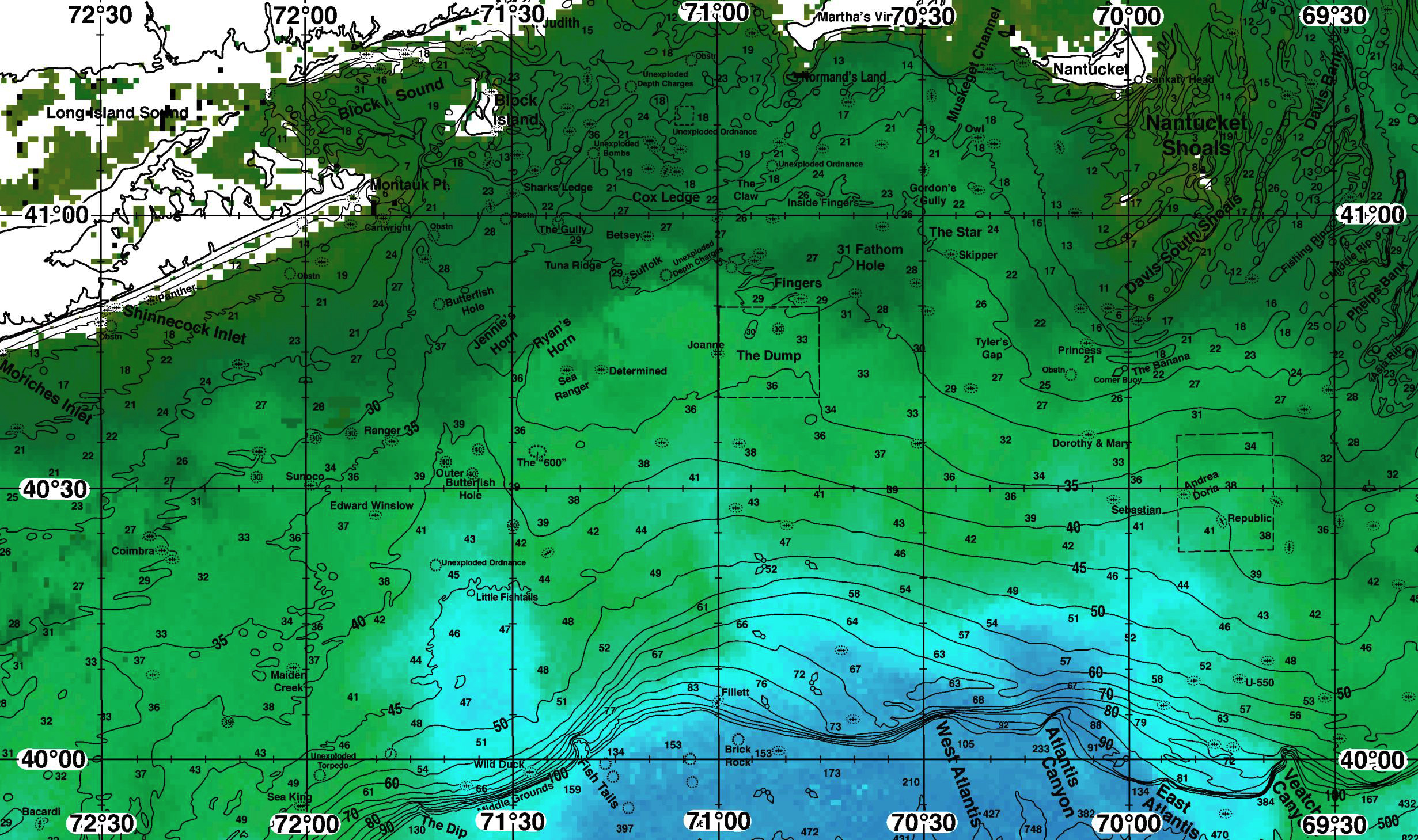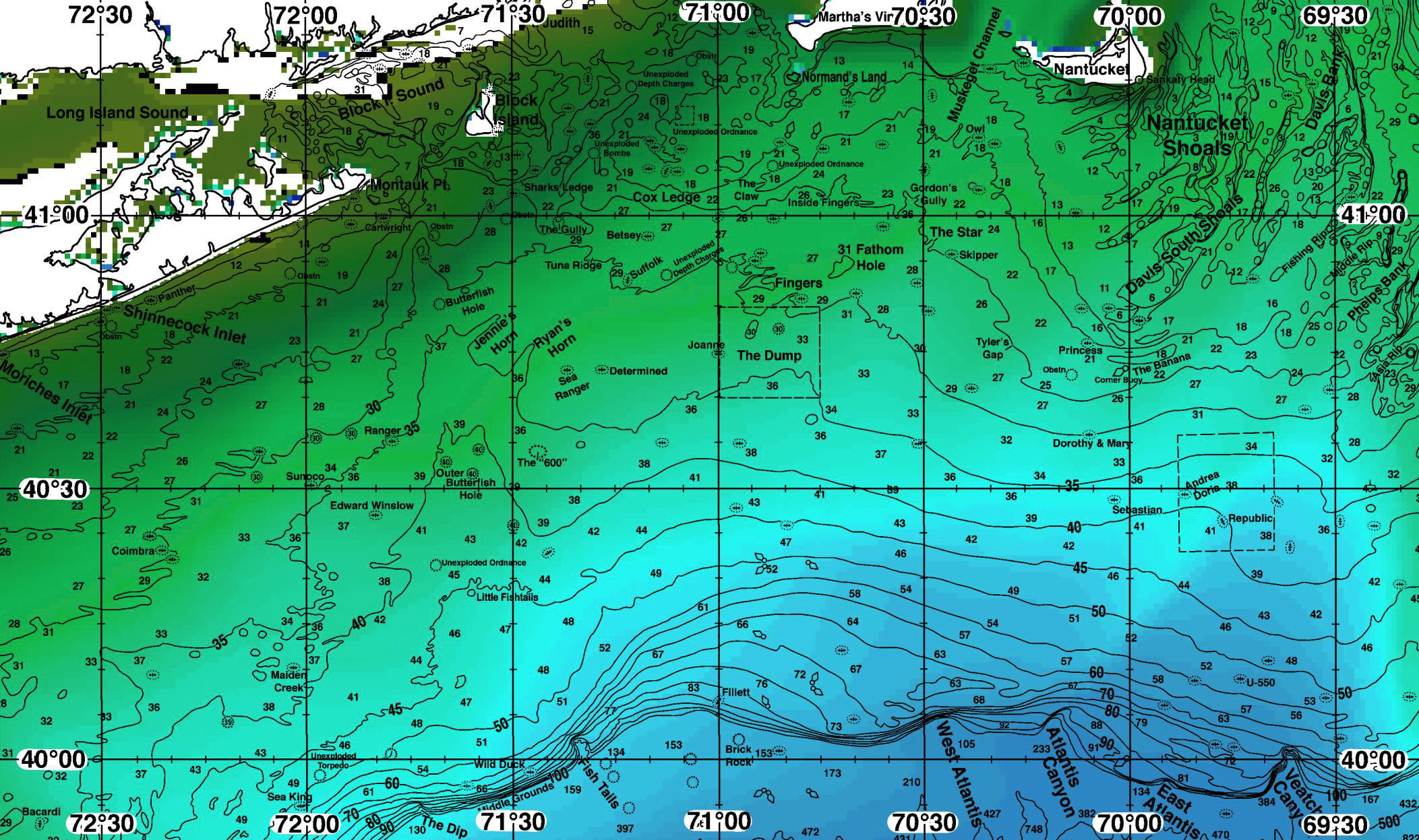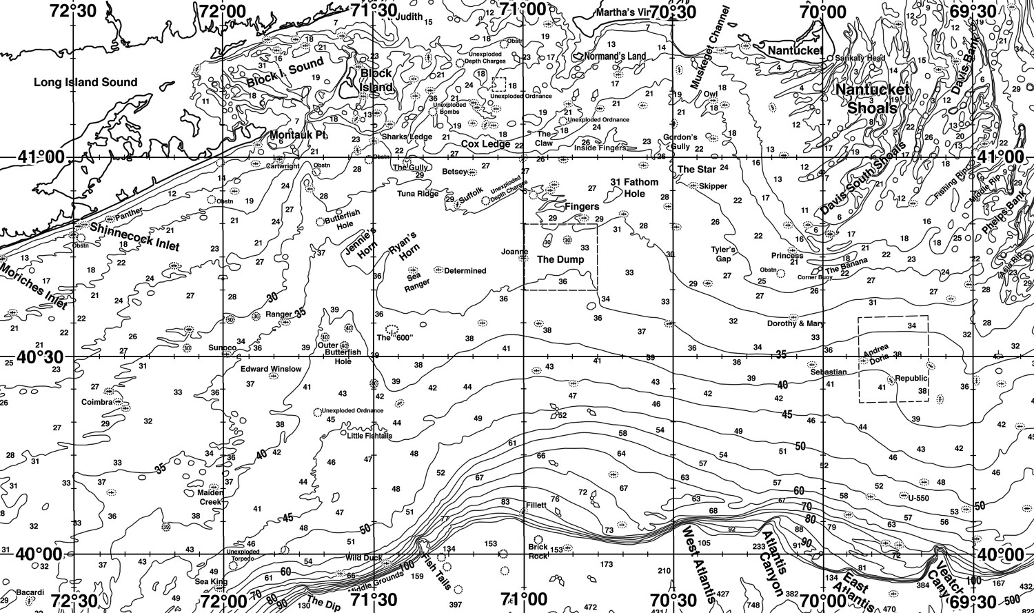 Areas of Interest: Coimbra, Cartwright, Butterfish Hole, Jennie’s Horn, Ranger, Sunoco, Edward Winslow, Outer Butterfish Hole, The “600”, Maiden Creek, Unexploded Ordnance, Little Fishtails, Fish Tails, Wild Duck, Middle Grounds, The Dip, Sharks Ledge, Unexploded Depth Charge, Unexploded Bombs, Cox Ledge, The Gully, Betsey, Suffolk, Tuna Ridge, Ryan's Horn, Joanne, Determined, Sea Ranger, Fillett, Brick Rock, Normand's Land, Gordon's Gully, Owl, Inside Fingers, The Star, Skipper, 31 Fathom Hole, Fingers, The Dump, Tyler's Gap, Nantucket Shoals, Davis Bank, Davis South Shoals, Fishing Rip, Middle Rip, Phelps Bank, Asia Rip, The Banana, Corner Buoy, Princess, Dorothy & Mary, Sebastian, Andrea Doria, Republic, U-550, West Atlantis Canyon, Atlantis Canyon, East Atlantis Canyon, Veatch Canyon Common Inlets: Bass River, Block Island, Buzzards Bay, Chatham, Cotuit (MA), Dartmouth, Falmouth (MA), Fire Island (NY), Martha's Vineyard, Montauk (NY), Mystic (CT), Nantucket, New Bedford (MA), Newport (RI), Niantic (CT), Oak Bluffs (MA), Old Saybrook (CT), Point Judith (RI), Shinnecock Inlet, Star Island, Westerly (RI), Westport (MA)Download Analysis Sample (PDF) - Lat./Long.
